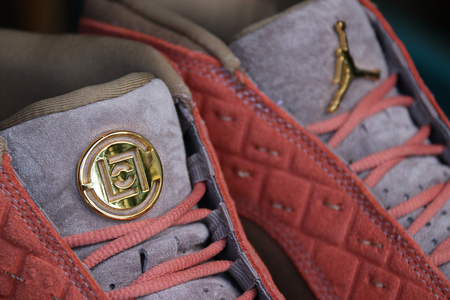 配色方案以酒红与灰色麂皮材质呈现,鞋舌和后跟妆点 CLOT 与 Jumpman 金色 Logo,彰显华丽的联名身份!