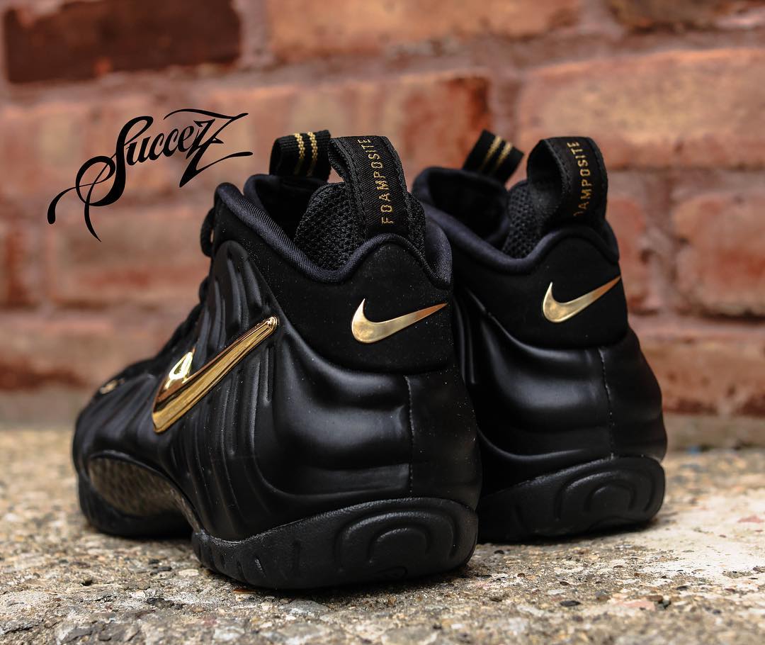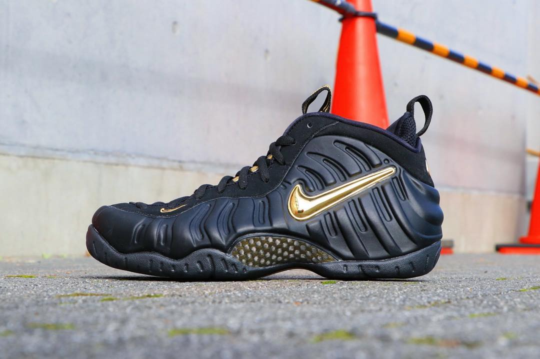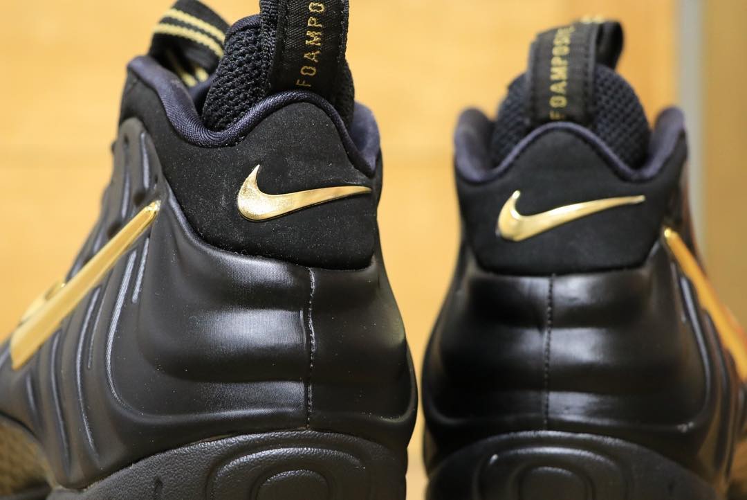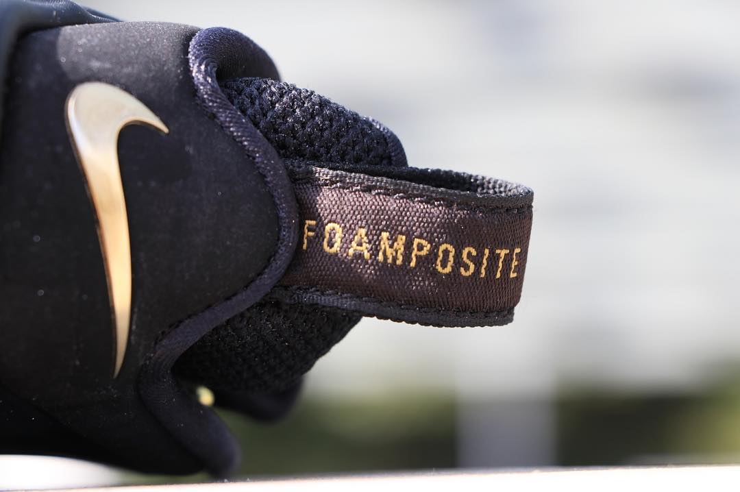 这双 Air Foamposite Pro 采用黑色哑光质感的发泡鞋面搭配液态金色 Swoosh,鞋头及后跟部位同样使用金色点缀,更是彰显气质。鞋舌处延续到鞋头的液态金装扮,绝对亮眼。