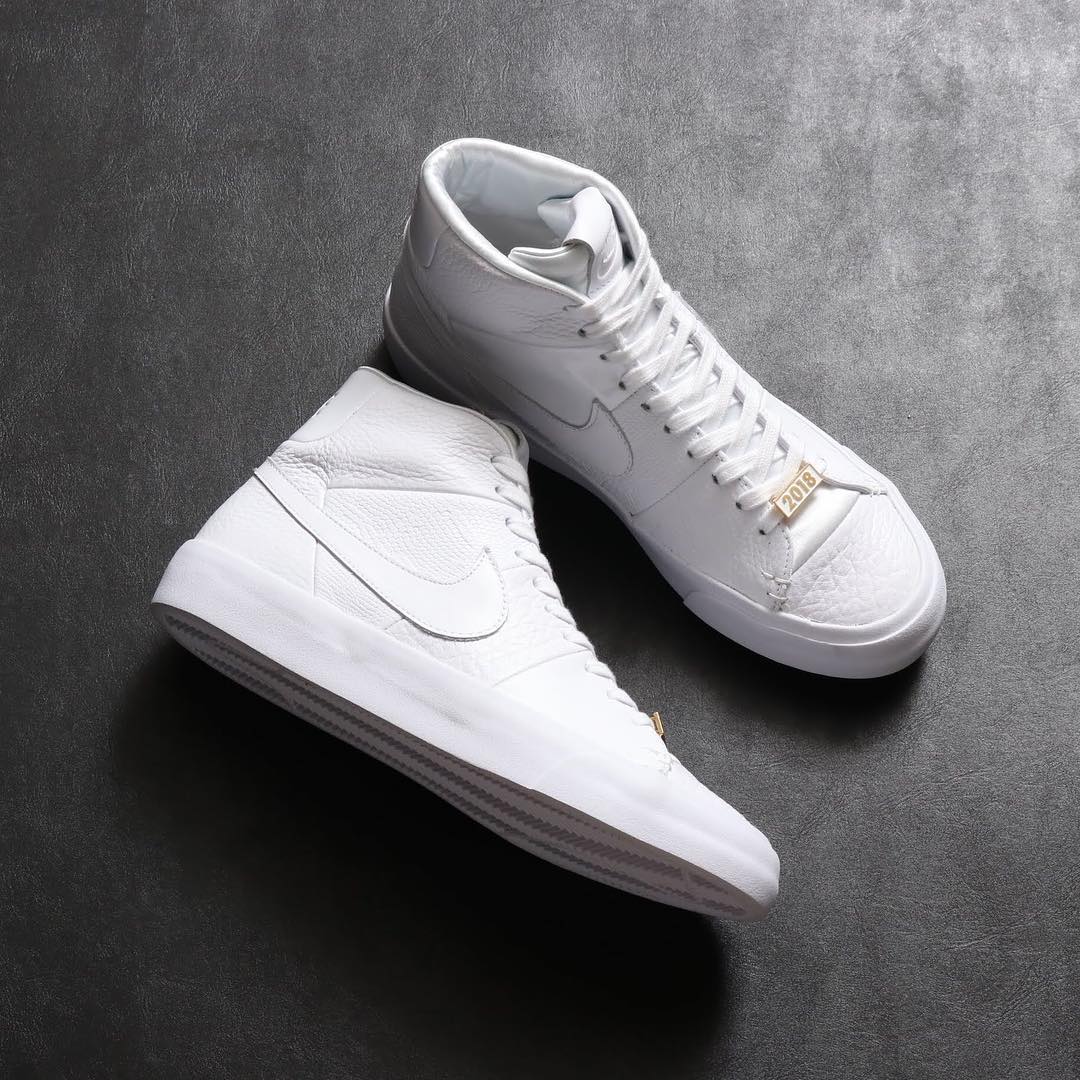 值得一提的是,该系列中还将有一款 Blazer 发售,鞋身由纯白色的优质皮革打造,营造出极强的层次感。鞋头处同样以金属 “2018” 吊牌彰显身份。