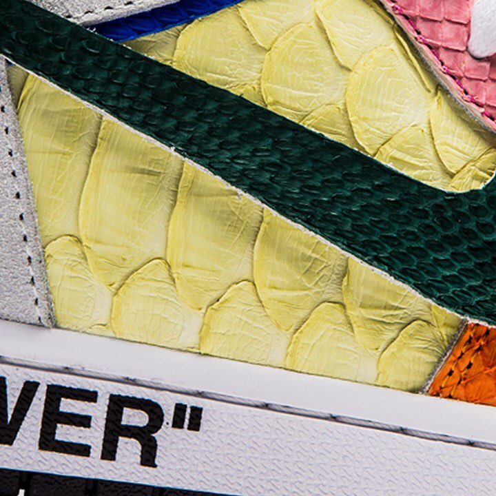 这双定制作品选用了村上隆太阳花作品中的 12 种颜色,以他们惯用的蟒蛇皮纹打造,依然保留了 OFF-WHITE 的解构文字,中底的 “FLOWER” 字样则表明了 “太阳花” 的灵感来源。
