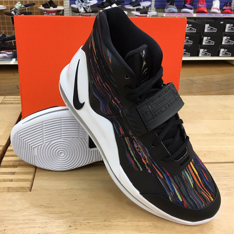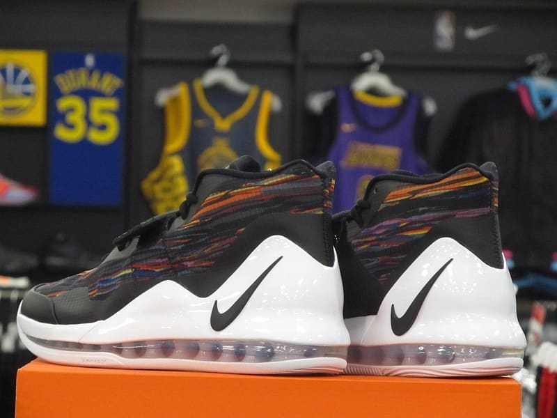 全新配色以经典黑白为主调,在黑色鞋面上加入深色调的多彩印花,鞋面上加入绑带固定后跟处的 Swoosh 非常醒目,可以说是一双颜值不错的实战新品。