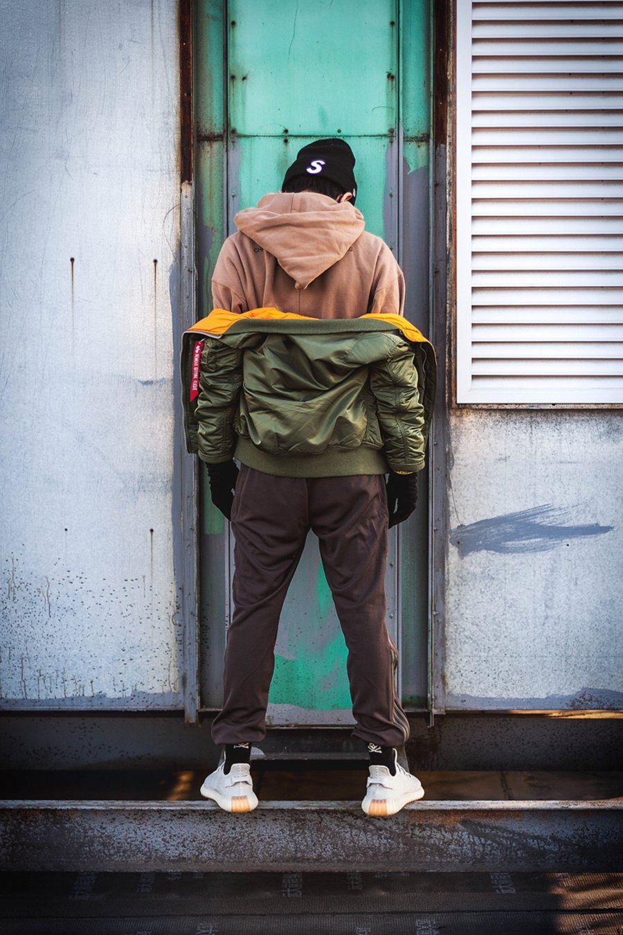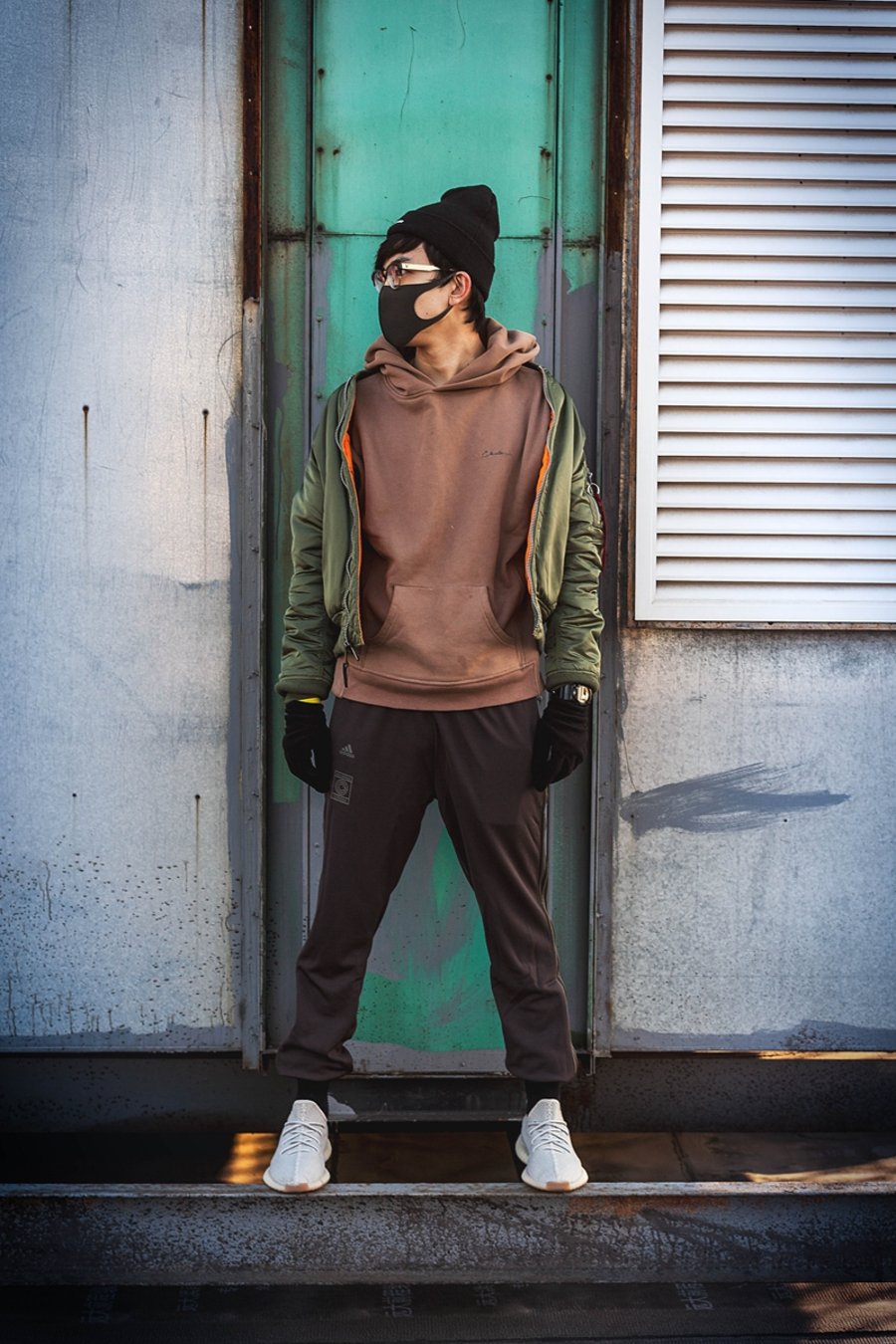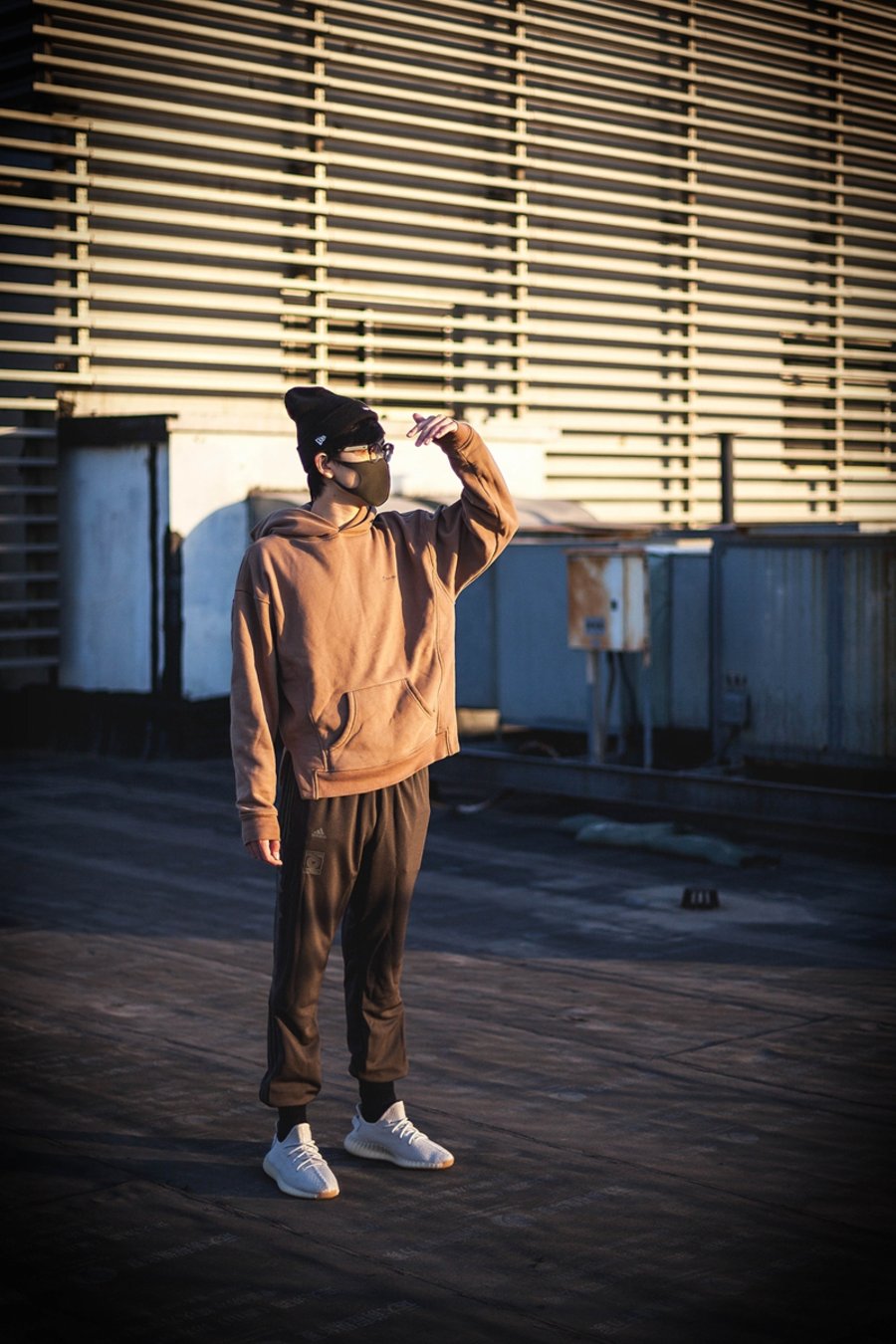 走在路上,搭配同样大地色系的 “侃爷神裤” adidas Calabasas Track Pant,不张扬却很抓人眼球,非常耐看。