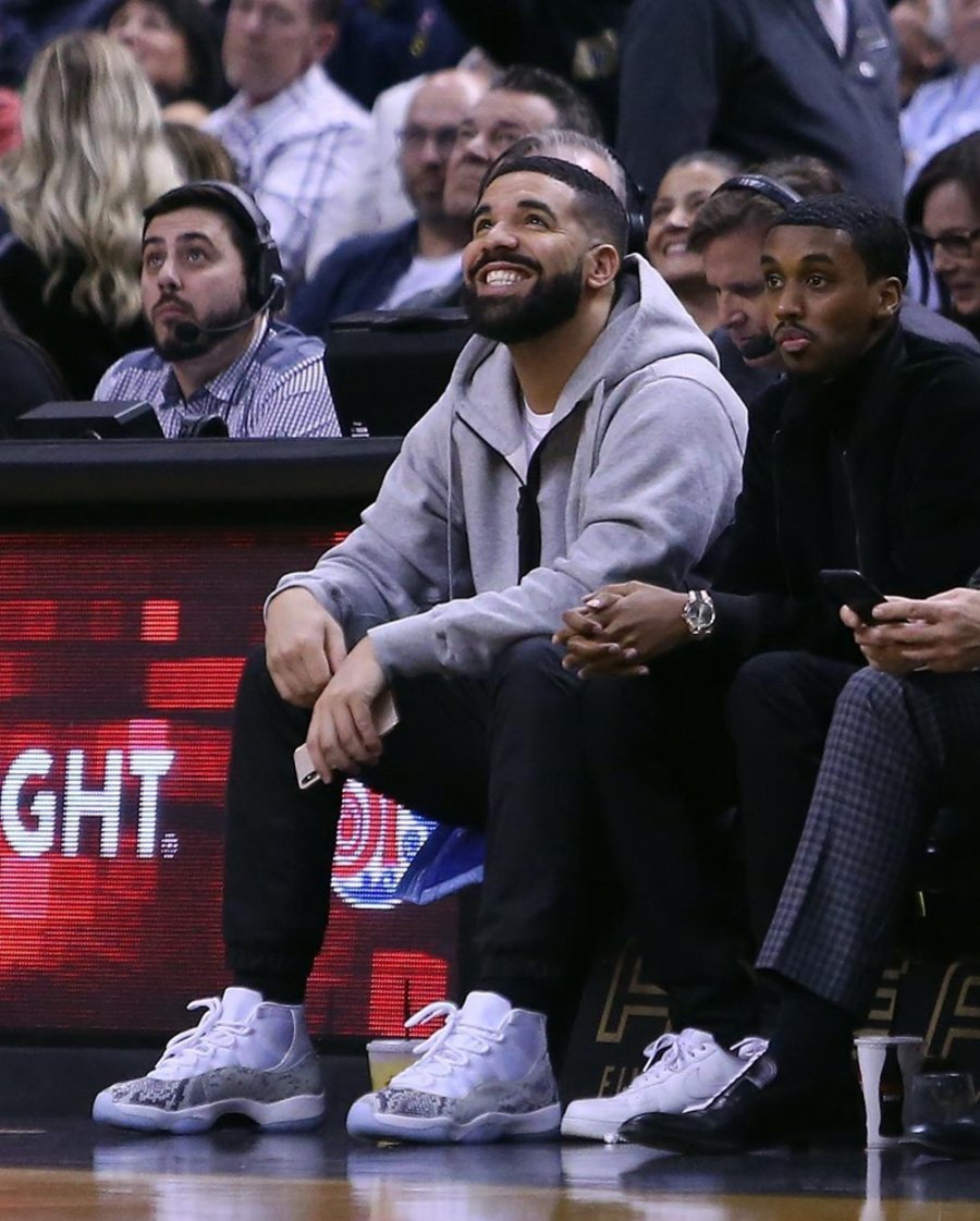 伴随着年底大魔王 Air Jordan 11 “Concord” 的正式回归,各路明星也都纷纷上脚 AJ11 以示致敬,与 Jordan Brand 重修旧好的 Drake 近日在赛场上脚了一双更为罕见的蟒纹版本!