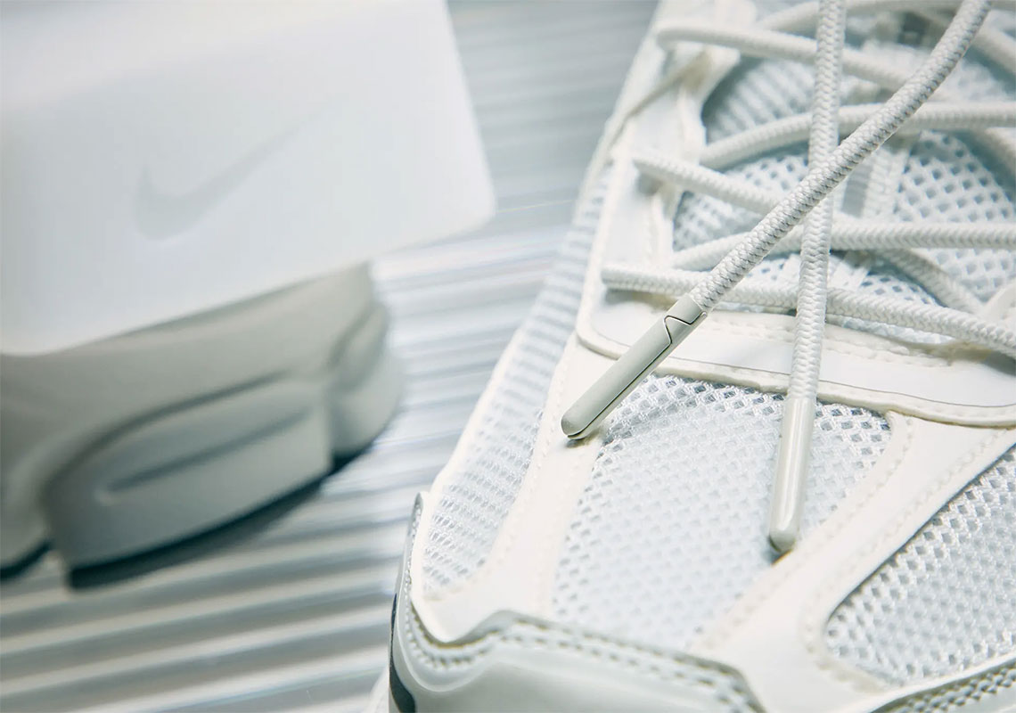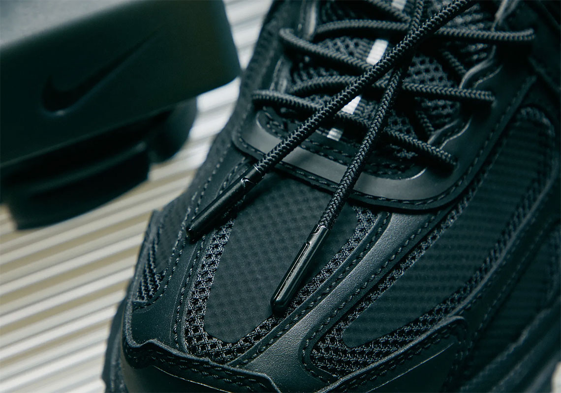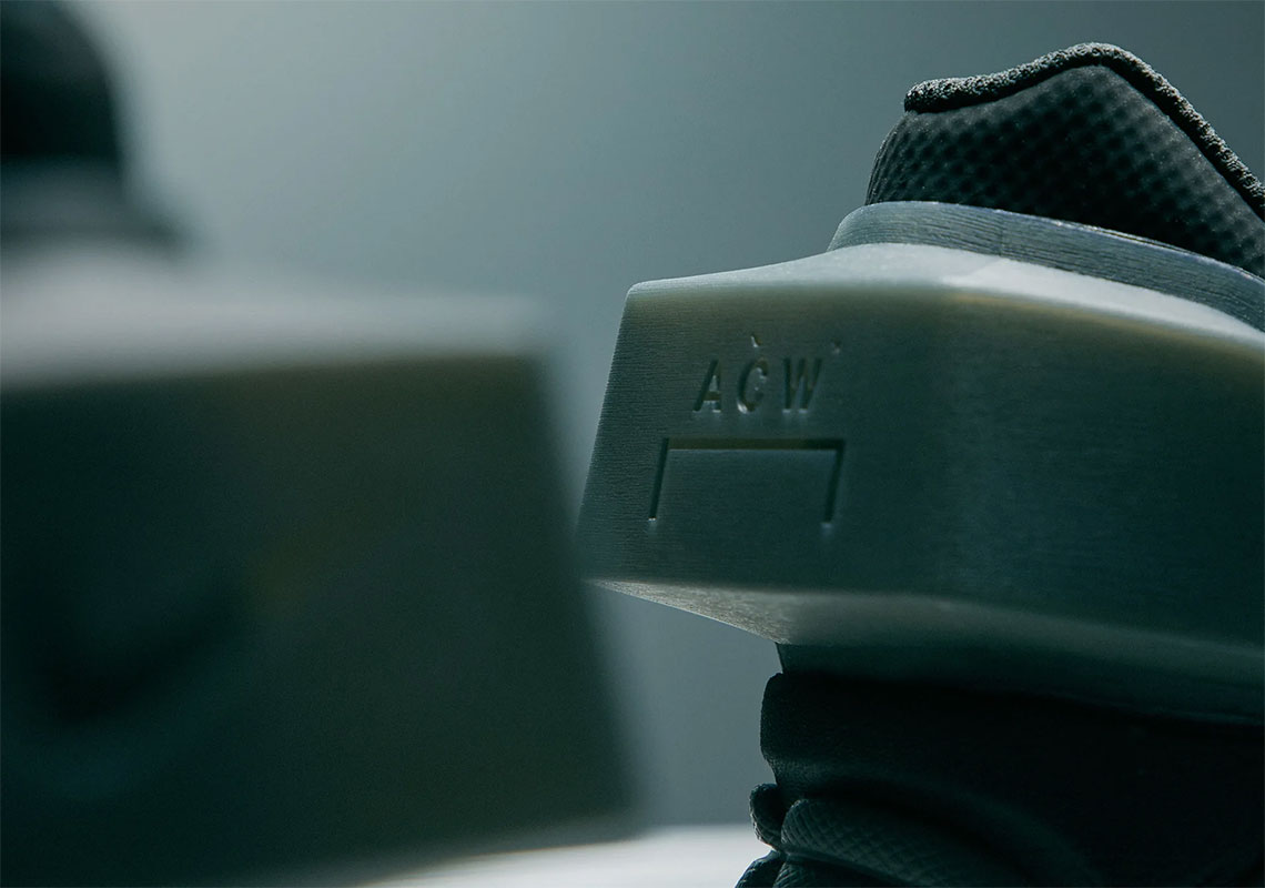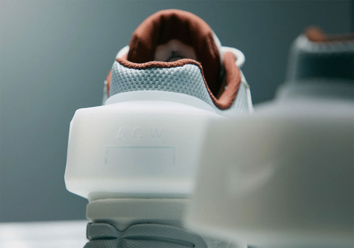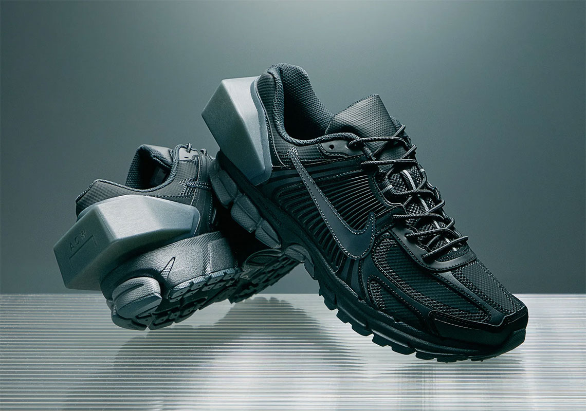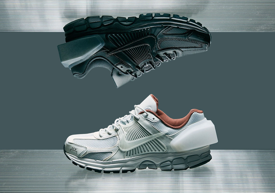 以 Nike 在 2010 年推出的 Nike Zoom Vomero+ 5 为蓝本打造。整体造型与原版颇为相似,但在鞋头添加标志性 ACW Logo,后跟处还大胆地加入方形模块设计,为鞋款增加强烈的科技感。