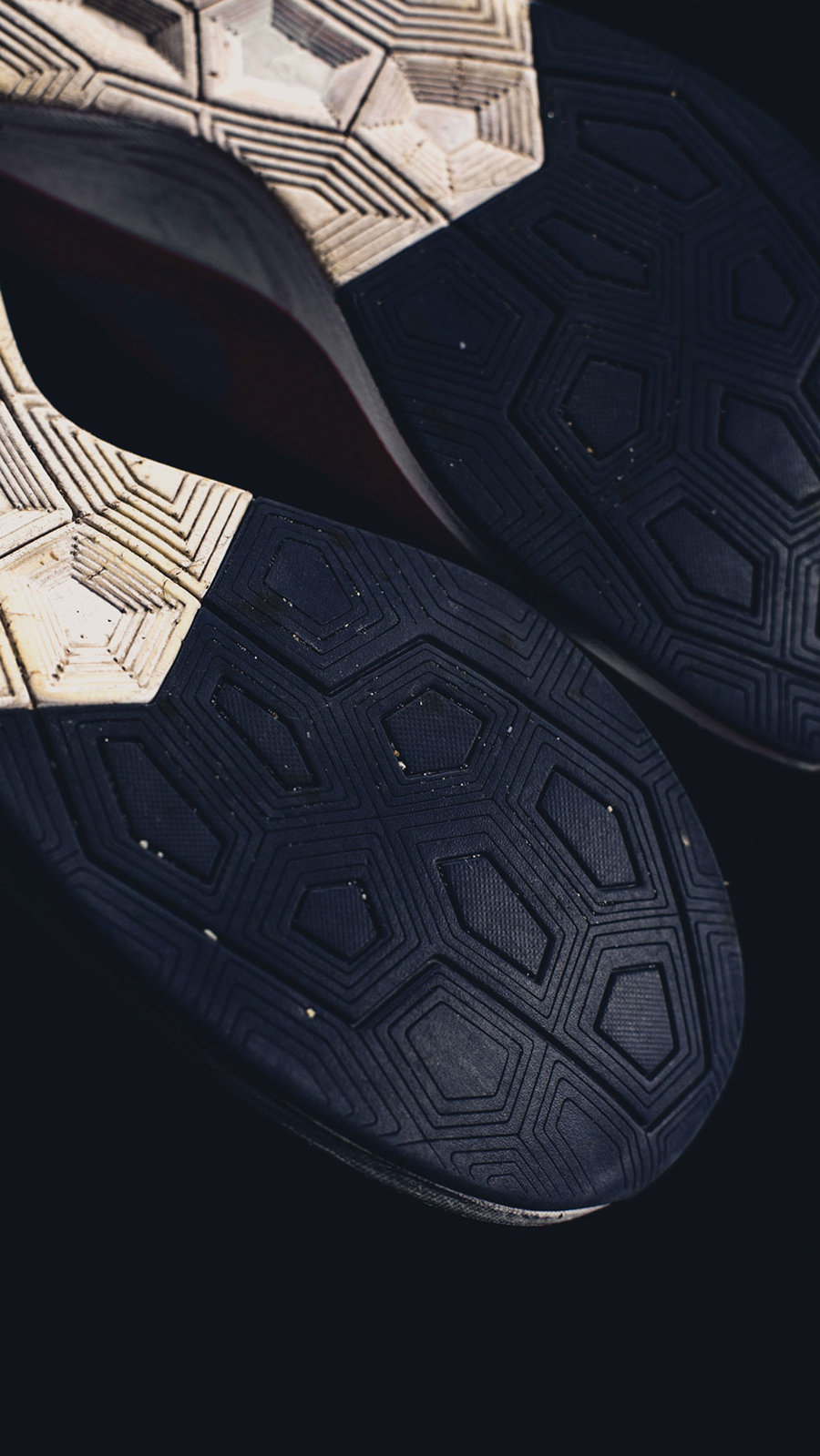作为初级跑者的小编,可能是跑姿也不太稳定,经历了 42.195 公里后,变成了这个状态,而抵达终点的精英跑者的鞋子则是另一种状态。