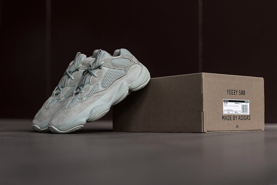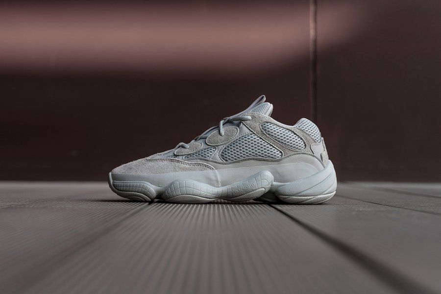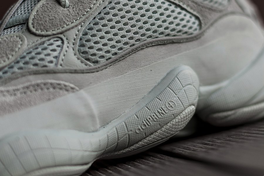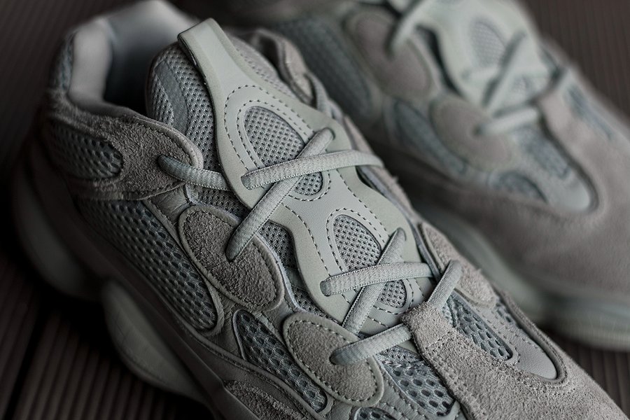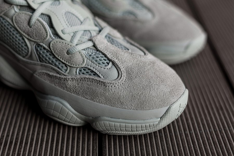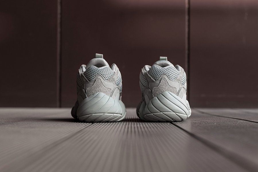 但不同于首发 Blush 的暖色调,这双 Yeezy 500 “Salt” 以灰色为主,透气网布材质略微有一点点偏青色。