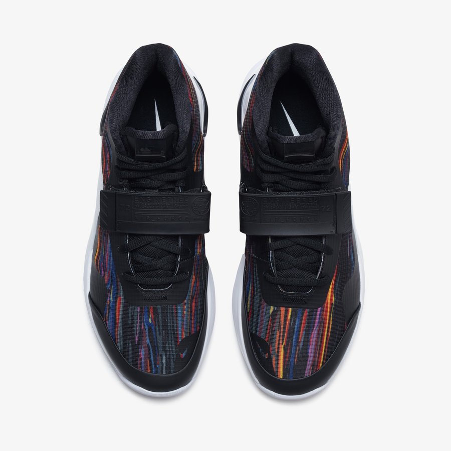 其中一双配色以经典黑白为主调,在黑色鞋面上加入深色调的多彩印花,中底支撑和外底以白色收尾;另一双配色则以纯黑色为主调,搭载冰蓝色水晶外底,看起来十分暗黑酷炫。