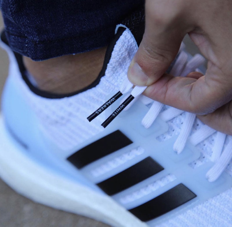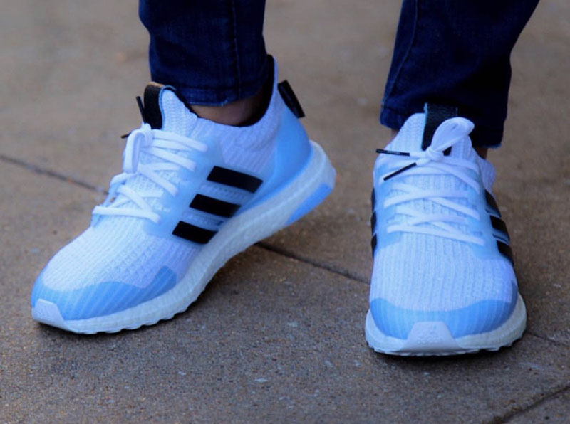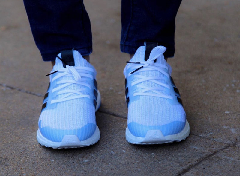以 Ultra Boost 4.0 鞋型为基础,白色鞋面辅以冰蓝框架与黑色细节点缀,营造北境异鬼寒冷冰霜的主题气氛。