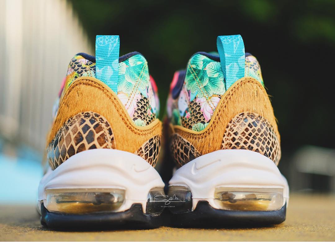 这应该算是所有 Air Max 98 的配色中设计元素最丰富的一双鞋。鞋面上半部为天津喷同款印花的皮革,中间为棕色马鬃毛材质,底部为类似鳞片的特殊纹理皮料,层次分明又完美结合。