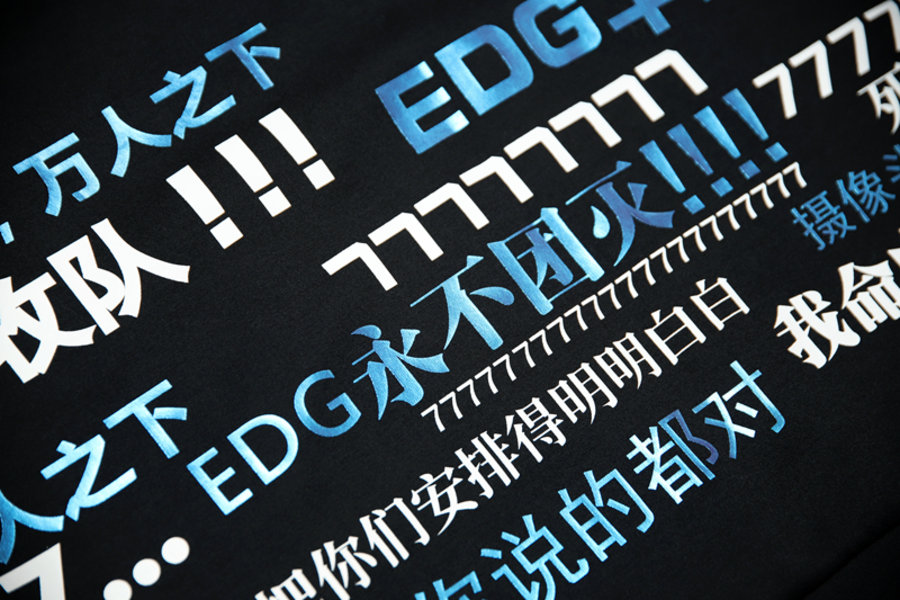 联名卫衣以弹幕为主题,与 EDG 相关的各种梗和应援口号从侧面一直延伸到背后,同时黑色底色搭配蓝紫色炫彩印刷酷劲十足。