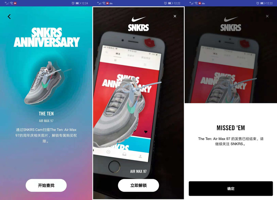 你要快速的对准 SNKRS 一周年的宣传图片,能到看到一个 AR 现实增强的 Air Max 97 立体图像,这时候你就有可能买到这双鞋!
