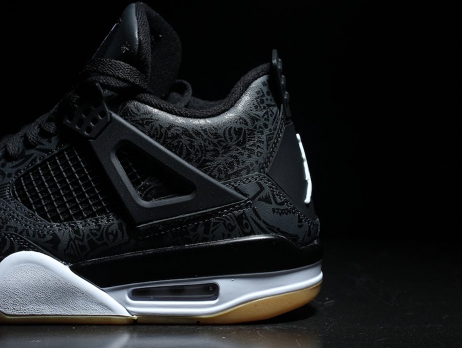 图案与早年的白银 Laser 镭射 AJ4 有着极为相似的外观表现,但制作手法却采用涂鸦印刷的方式呈现。黑色覆盖鞋身,搭配白色中底及生胶外底,硬朗干练的外观之下,更流露出精致不凡的丰富细节。