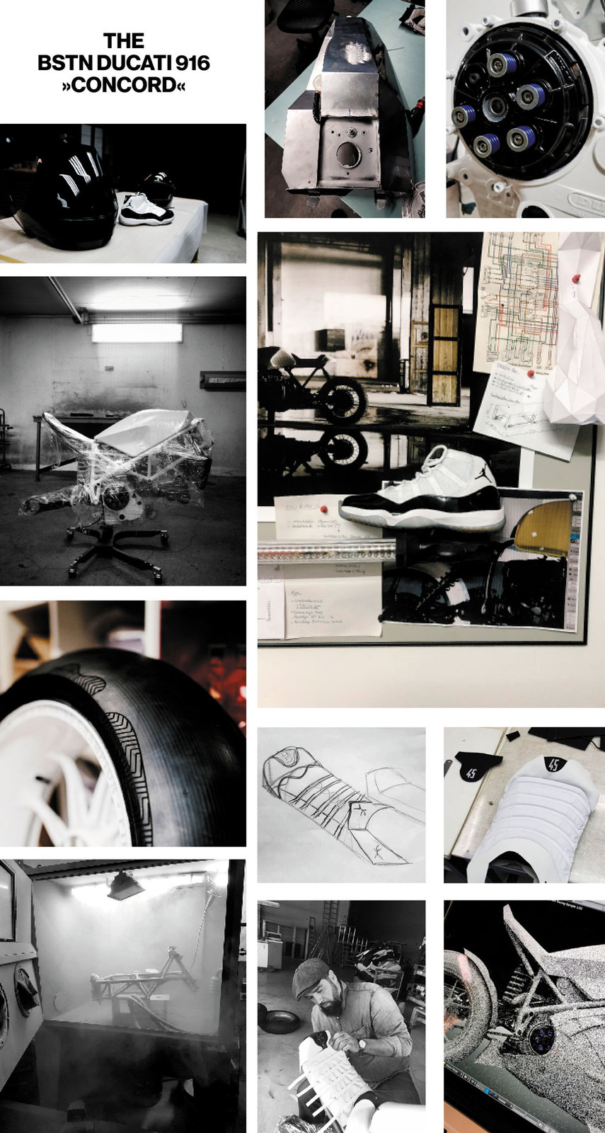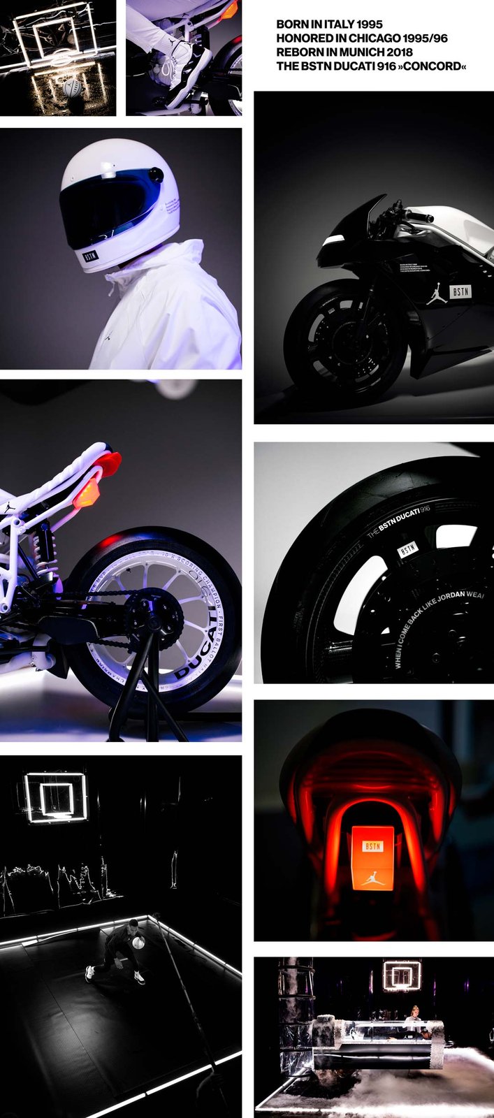 为了给 Concord 造势,Jordan Brand 首次为复刻鞋款制作广告。而德国知名球鞋店铺 BSTN 更是下血本,打造了一台 Concord 主题 Ducati 916 摩托车!
