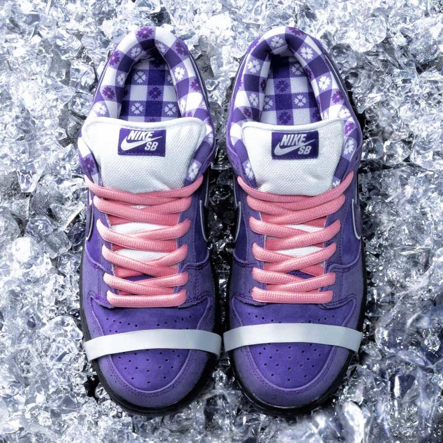 本次,Concepts x Nike SB Dunk Low “Purple Lobster” 鞋身采用紫色麂皮搭配同色系斑点皮革打造,白色鞋舌与格纹内衬营造出强烈的视觉反差,附赠白、黑、粉三款鞋带,提升搭配的可玩性。