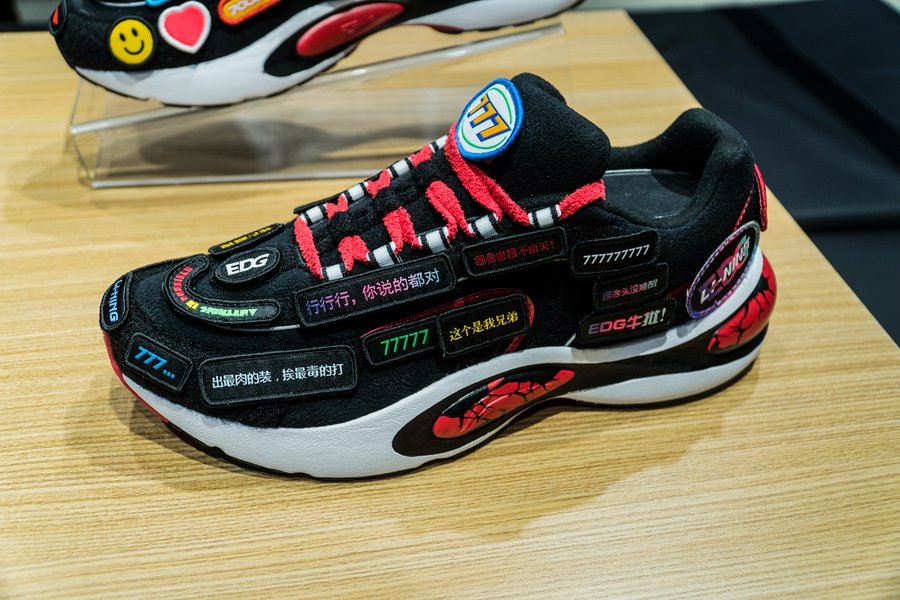经常看直播的朋友一眼就能看出,此次的设计灵感来自弹幕。在联名版 V8 跑鞋上带有弹幕魔术贴设计,“777777777”、“我命由我不由天” 等极具 EDG 特色的 “骚话” 装扮鞋面,极具可玩性。