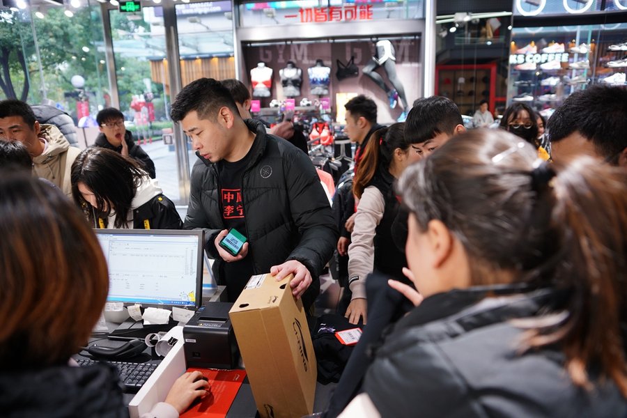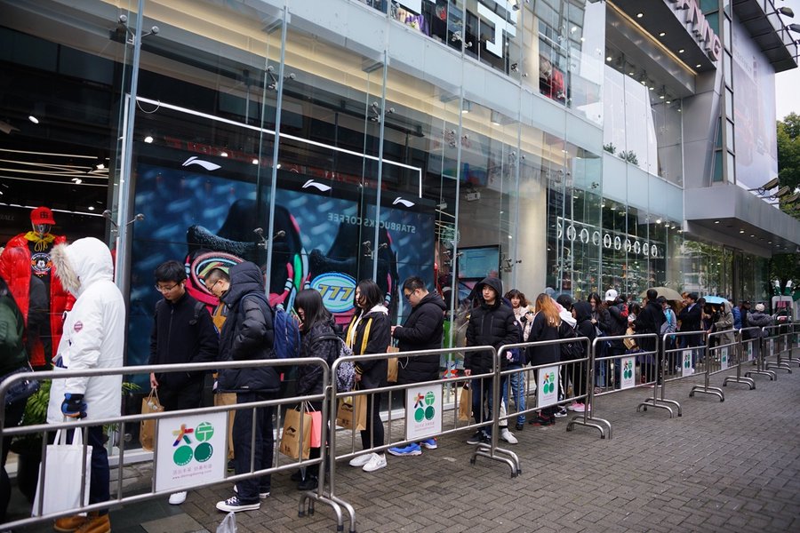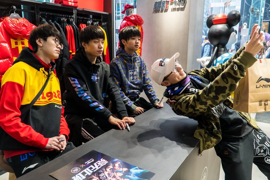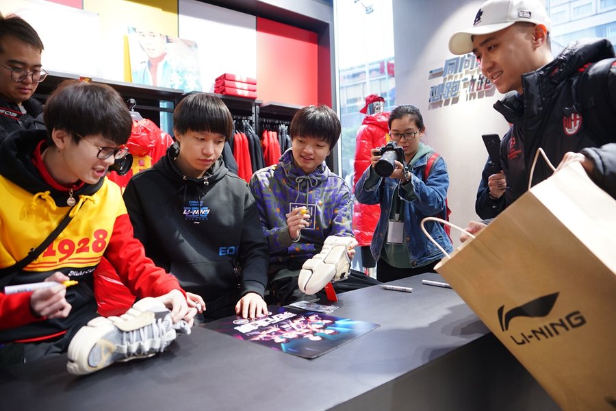 在 EDG 选手到场之前,粉丝们早已涌入李宁上海大宁国际店,抢购联名单品,提前到场的小编也得以近距离观察产品的细节。▼ 粉丝提前抢购联名单品