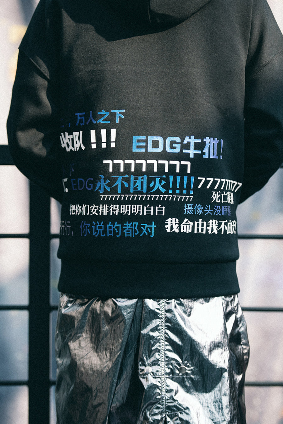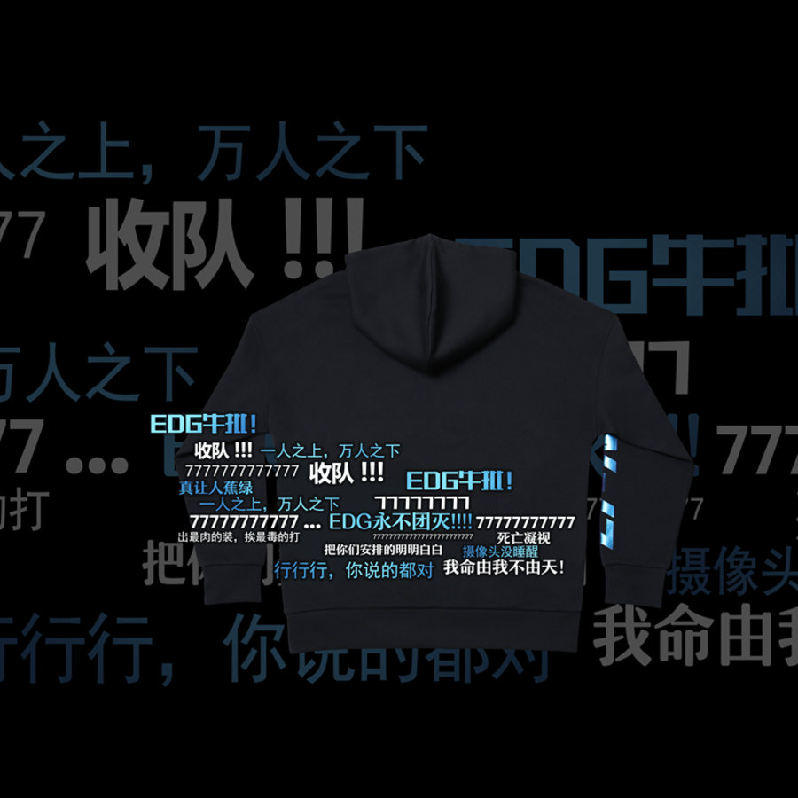 超酷的蓝紫炫彩印刷工艺仍然让这款帽衫拥有极高的个性指数,灵感来自于电竞比赛时的炫丽灯效,穿上它你也能像 EDG 一样成为目光焦点。