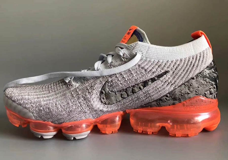 Air VaporMax 3.0 率先曝出的是 Nike 经典的 “Moon Landing” 配色,灰色的编织鞋面搭配暖橙色的可视气垫,极具辨识度,Swoosh 与 后跟稳定器则换上了月球表面装扮,想必有着不俗的辨识度。