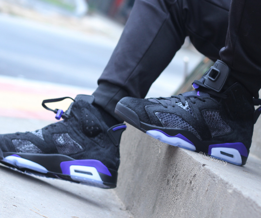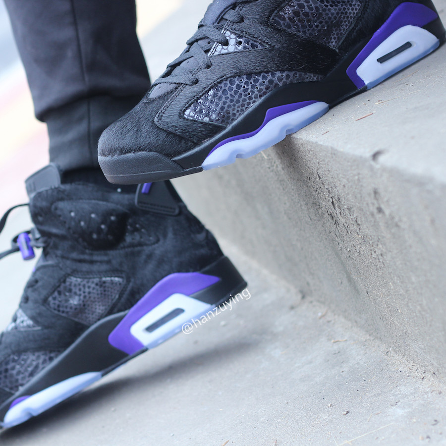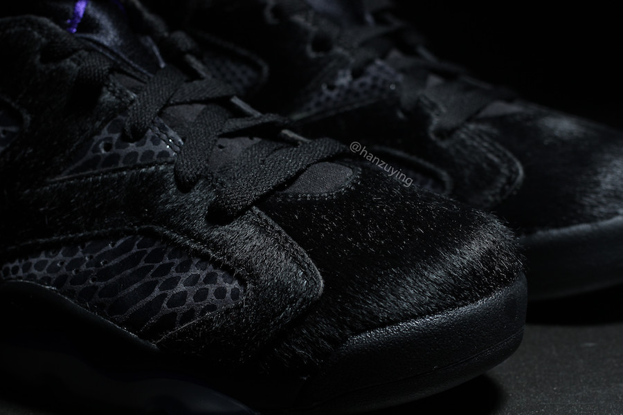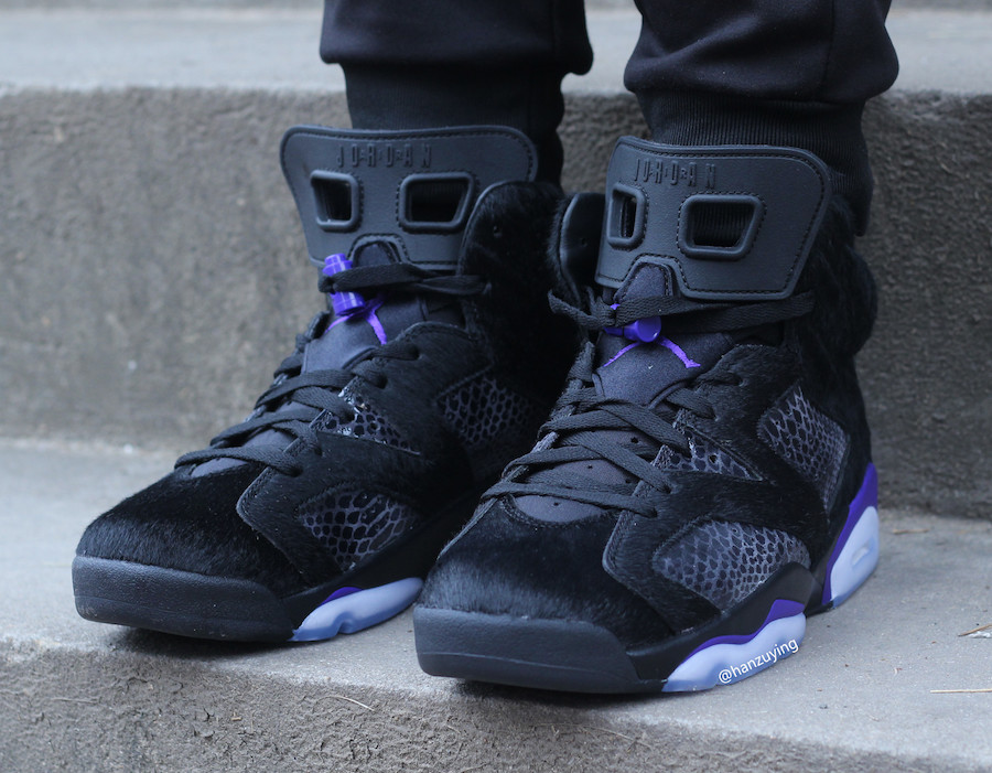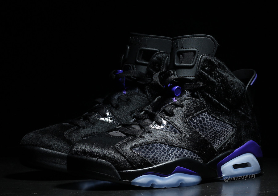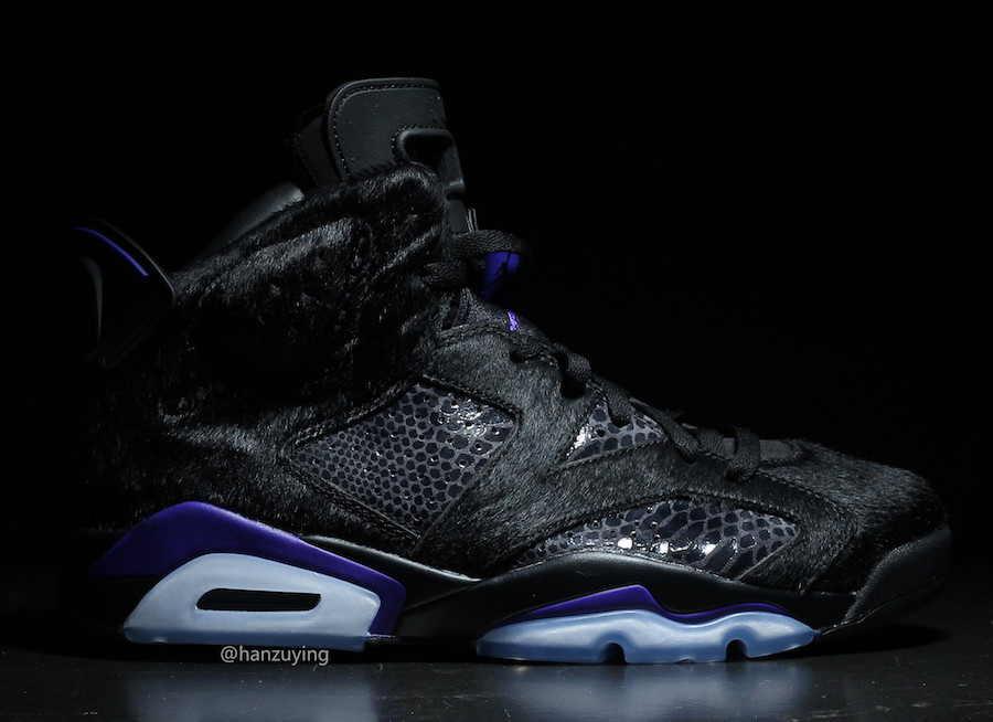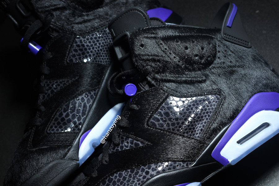 不难看出,鞋面的材质与传统牛巴革、荔枝皮不同,换上了马毛与蟒纹设计,让这款 Air Jordan 6 尽显狂野气质,黑色与紫色的配色方案同样相得益彰,想必会有不俗的人气。