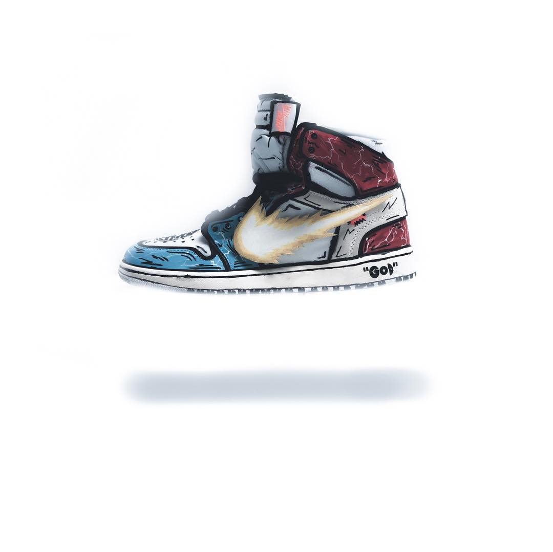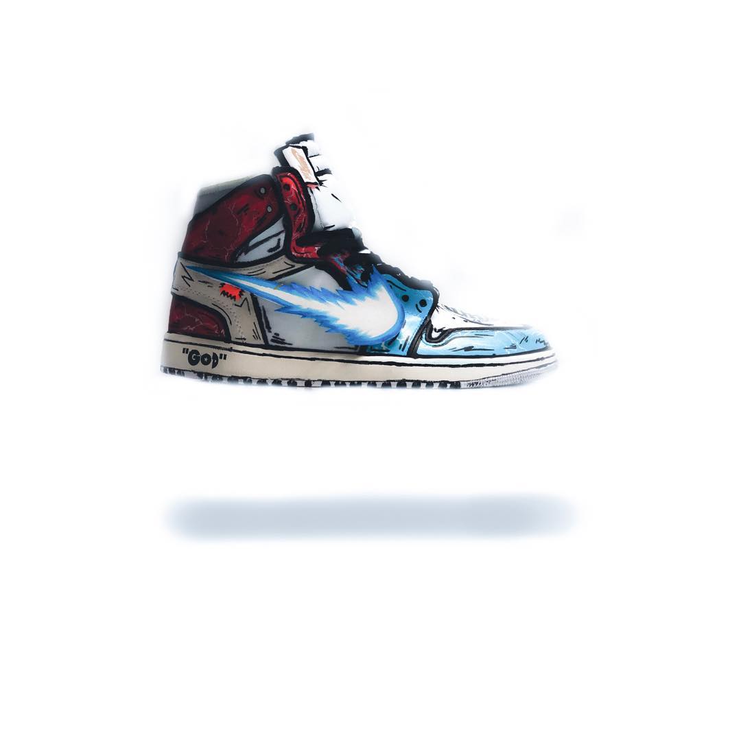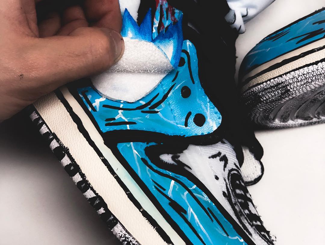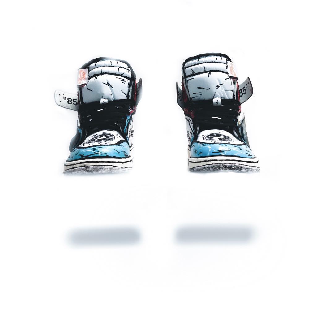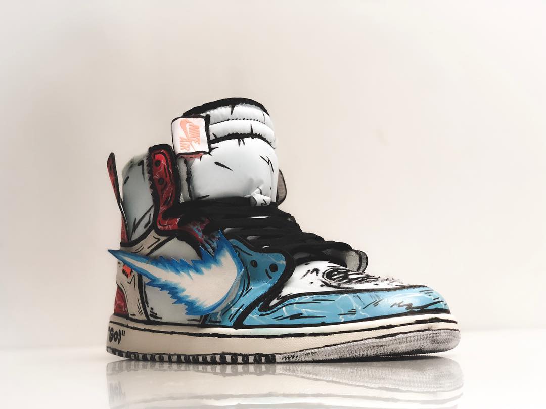 以纯白 OFF-WHITE x Air Jordan 1 为蓝本,延用颇为火热的二次元素描打造的鞋身,辅以 “爆气” 细节点缀,最具辨识度当属的 Swoosh Logo,换上了龟派气功的装扮,鞋头处则以武道服的 “界王” 标注,绝对彰显个性的定制设计。