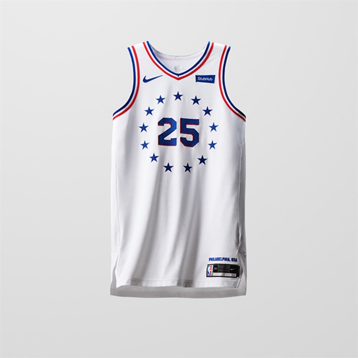 费城的成就版球衣将胸前标志性的 13 颗星星印在白底上。