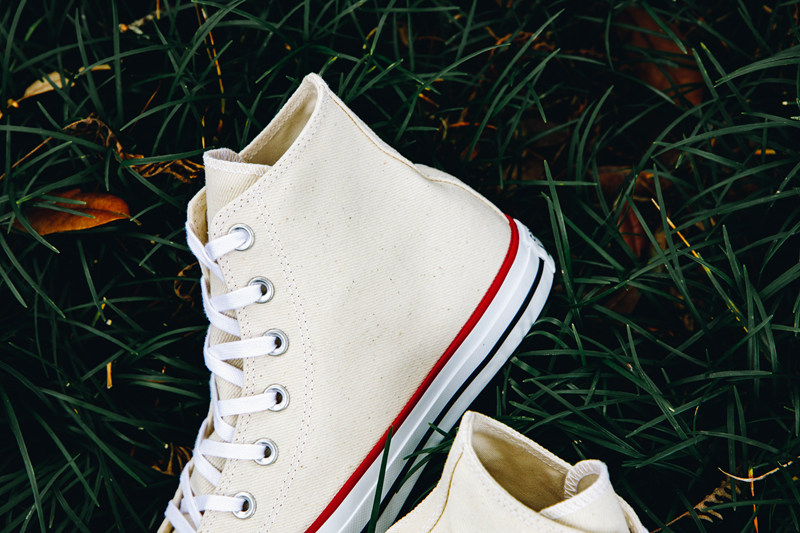 设计蓝本为 Converse 最经典的造型,换上奶白色的帆布鞋面,并辅以红黑双色线条勾勒细节,颇具复古气息。