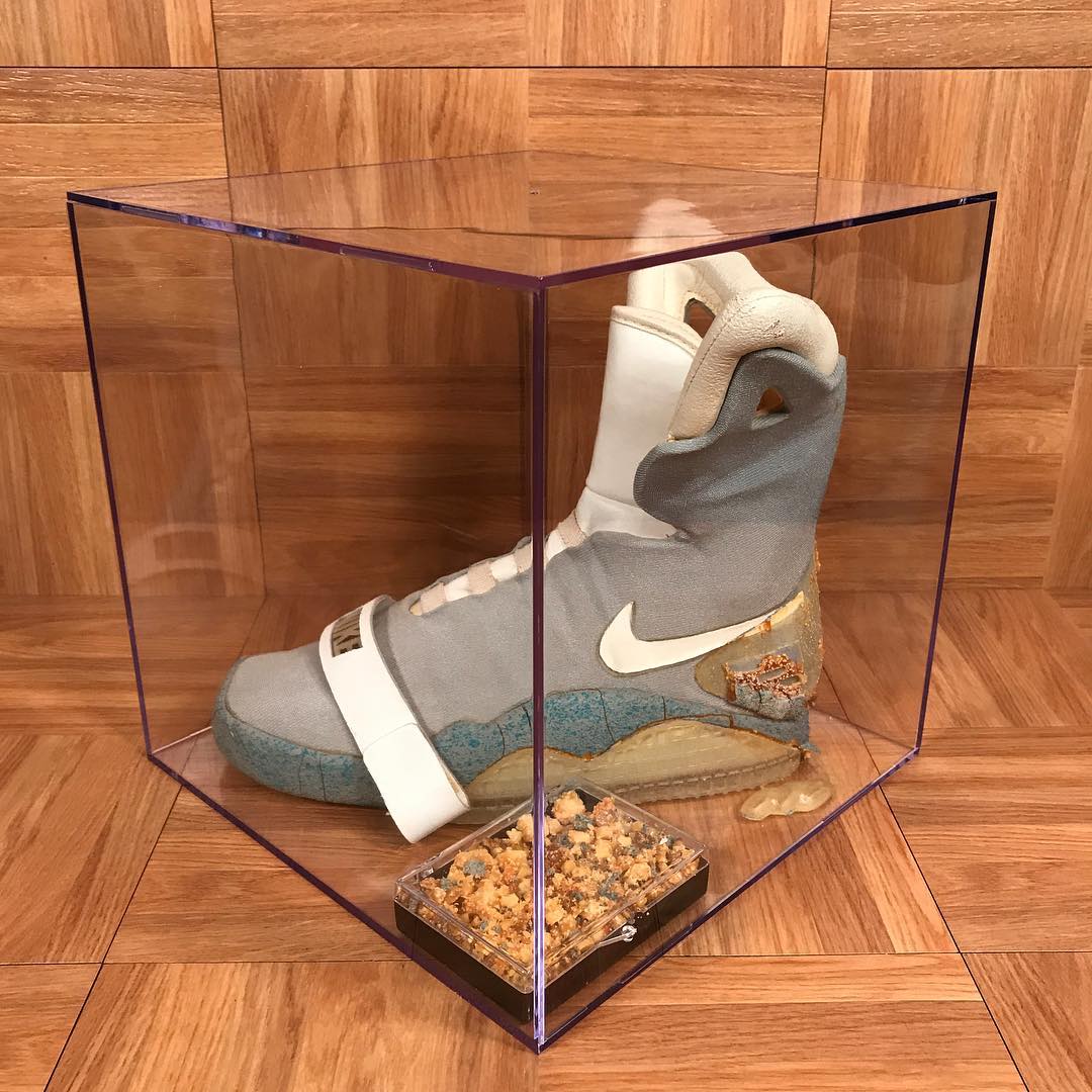 要说当属最珍贵的还是这双元年版本的 Air Mag,由于年代已久,即便被封起来保存也难挡氧化的过程,后跟的海绵早已发黄脱落,尽管如此这双 OG 版本已久在 Ebay 上拍出了近十万美元的天价。