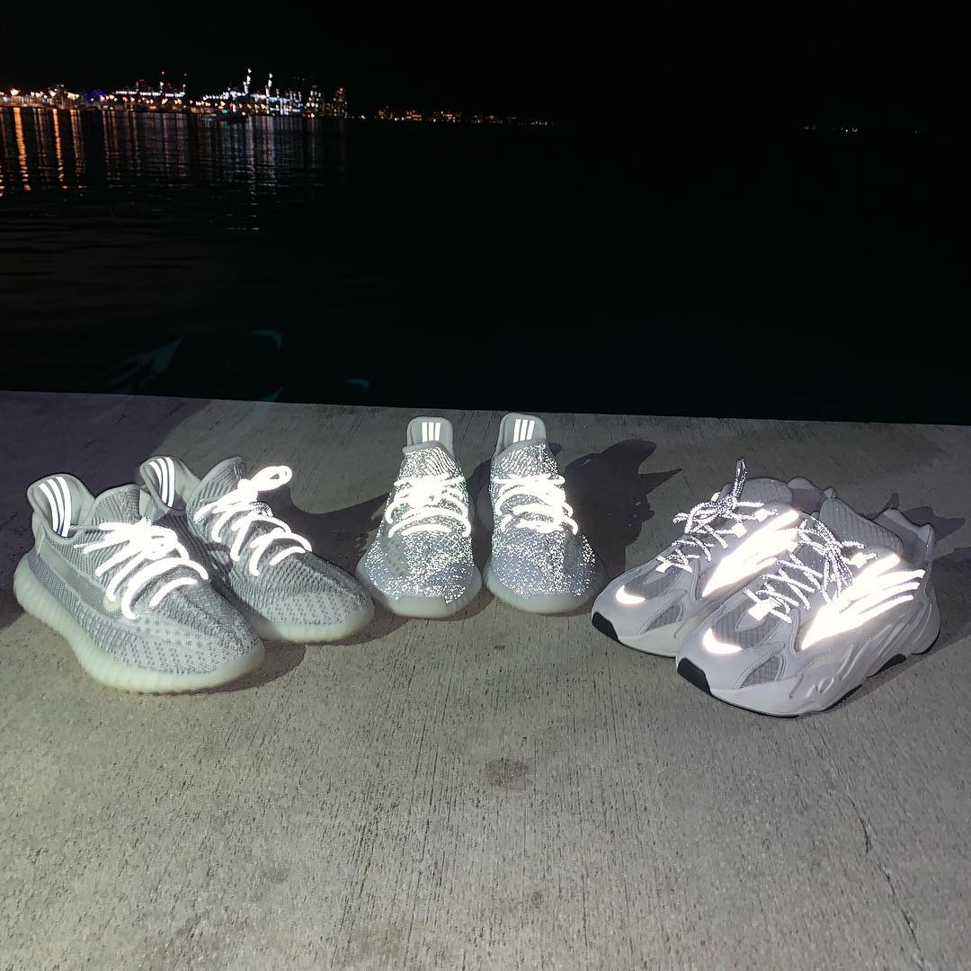 同时 @yankeekicks 还晒出了这两款 Yeezy 350 V2 “Static” 以及即将发售的 Yeezy 700 V2 “Static” 三款反光新品的对比图,在夜间都极为炫酷。