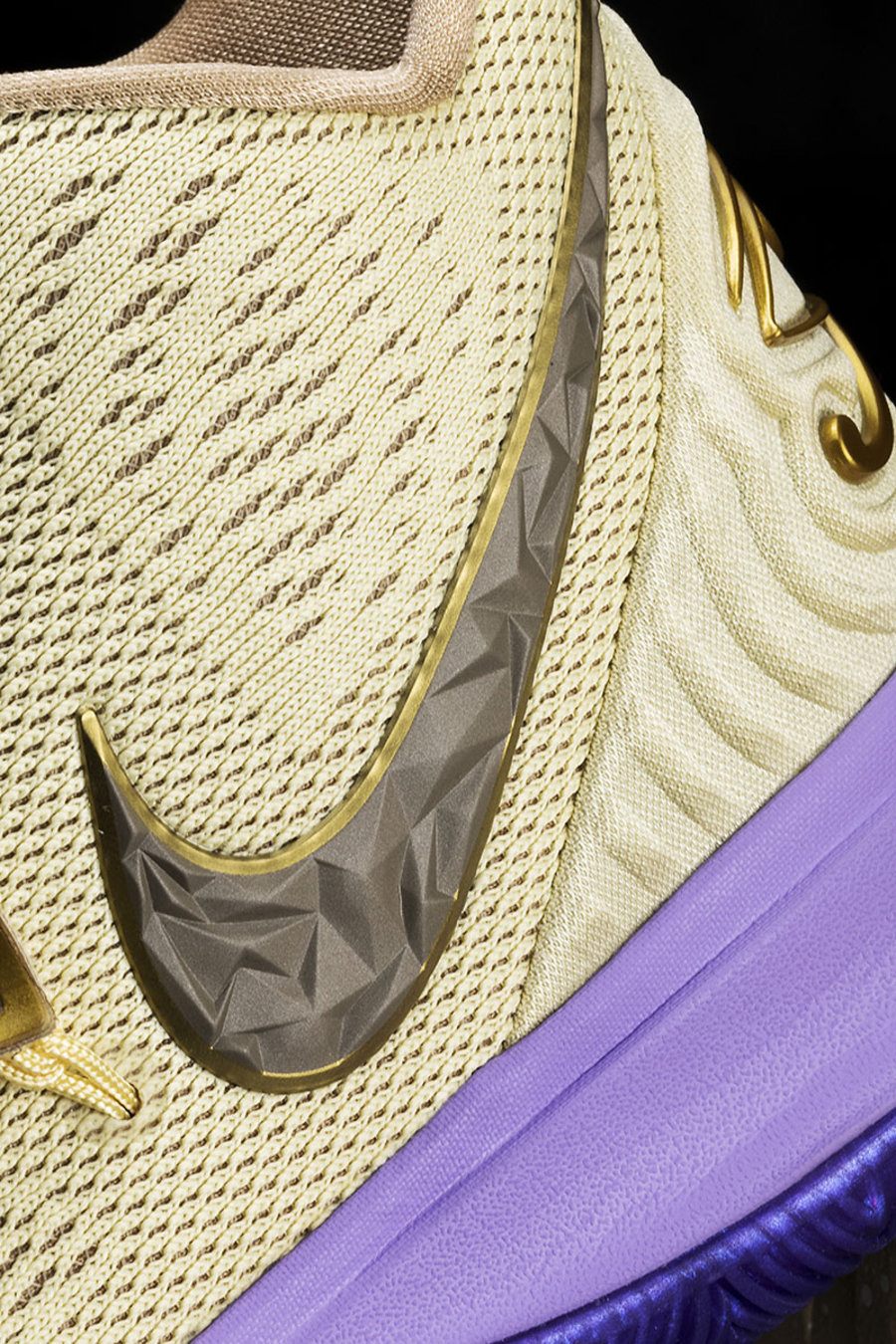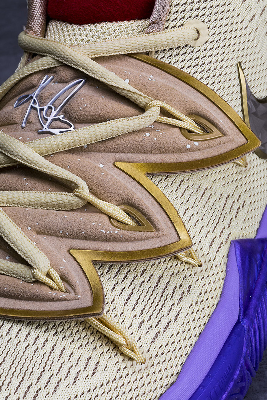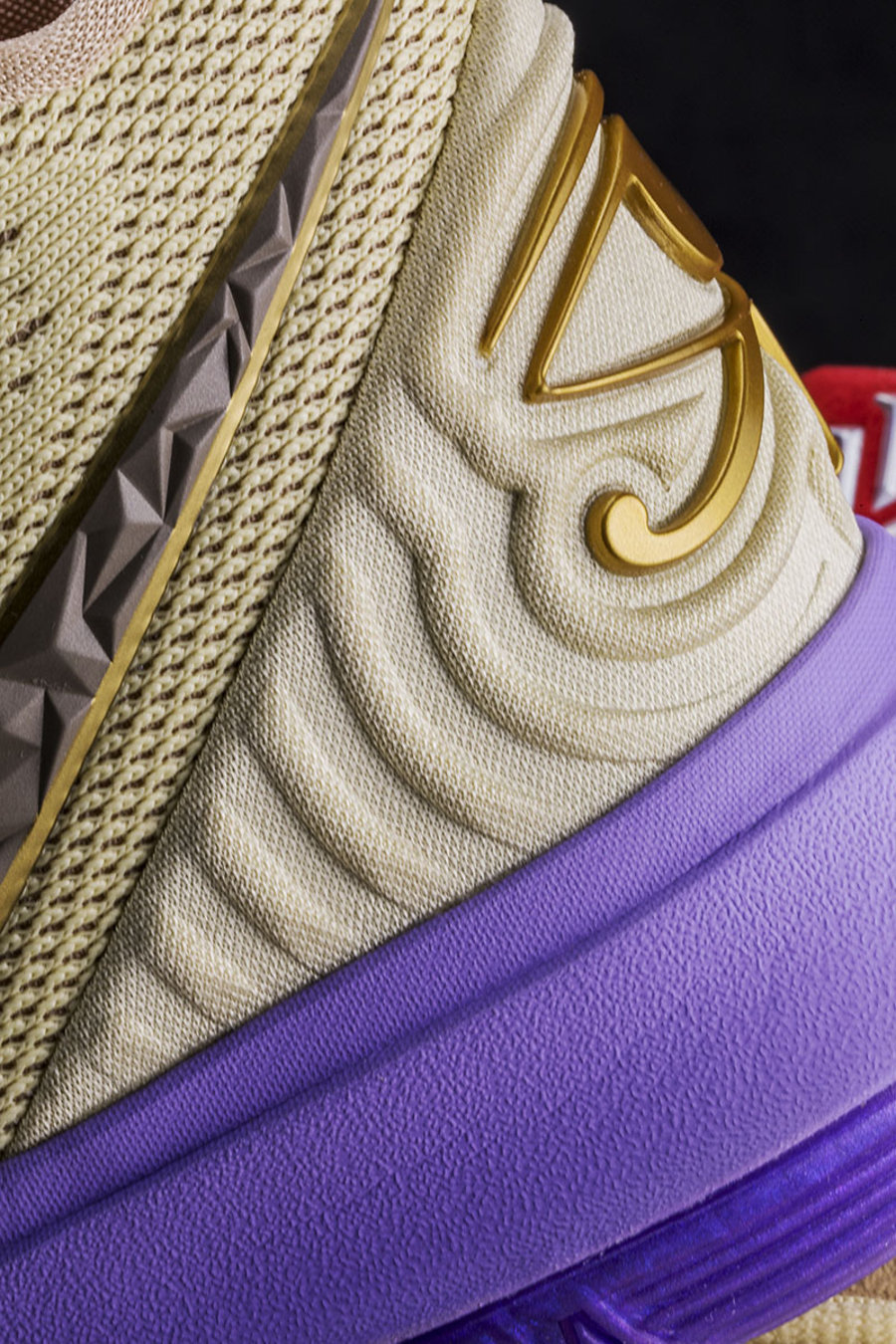 搭配本次 Kyrie 5 极具辨识度的捕蝇草造型,翻毛皮革打造金色镶边,犀利的战斗气氛之下,更流露出典雅的不凡气质!