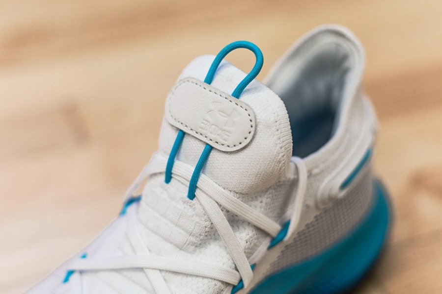 纯白鞋面搭配北卡蓝鞋底及鞋带扣,鞋垫与外底辅以充满童真的手绘雪花图案点缀,致敬库里在北卡罗来纳州度过的童年时光。