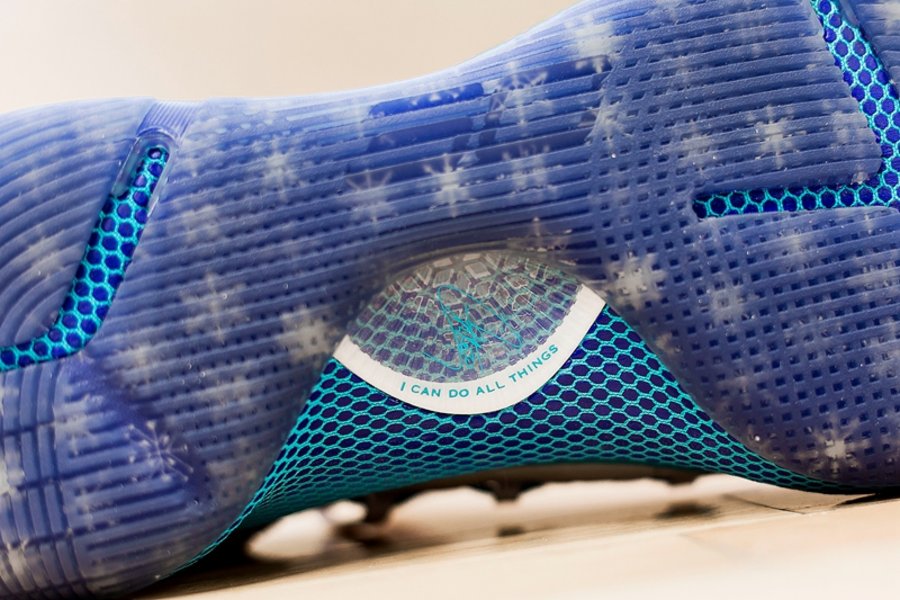 采用环形及纵向纹理交叉呈现,尽可能多的接触地面,增加抓地力。前掌及后掌进行针对性的镂空设计,外露抗扭转片部分为库里签名和 “I Can do All Things”。