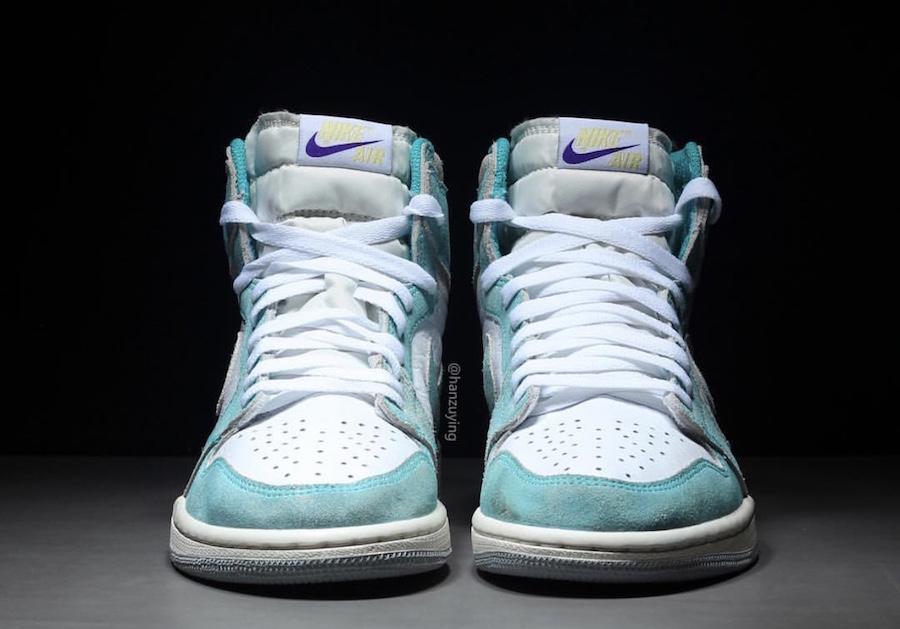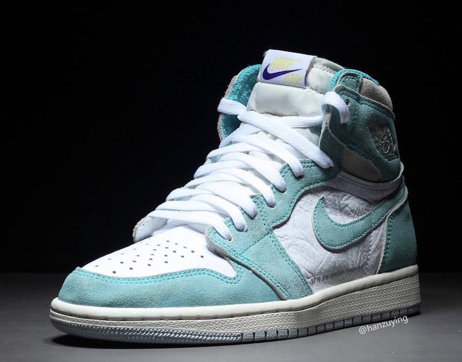从释出的实物图来看这双 Air Jordan 1 “Turbo Green” 以白色、蒂芙尼绿为主调,鞋帮细节辅以灰色进行点缀,翻毛皮革搭配做旧的皮革鞋身,呈现极佳的质感。