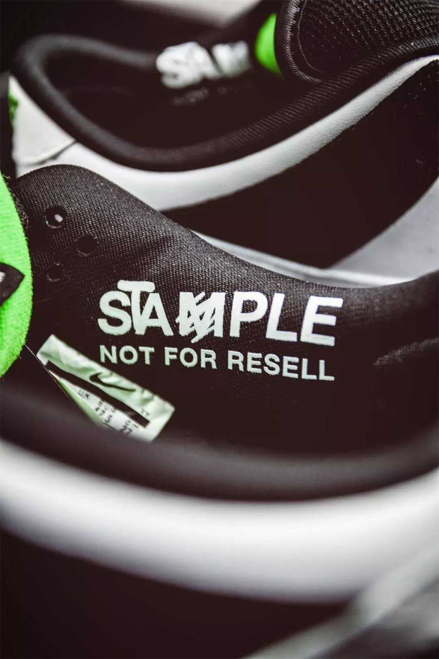 不仅有着讨好的黑白熊猫装扮,鞋头采用了 “黑脚趾” 设计,在内衬还有恶搞 SAMPLE 字样的 “禁止转卖” 文字。