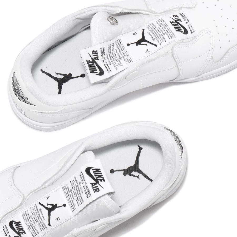 另外,由于取消了鞋带的设计,进而在鞋舌位置和后跟位置以 Jordan Brand Logo 和 Nike Swoosh Logo 的标签贴装饰,并将以往的 Swoosh Logo 位置改为针孔勾勒形状,整体材质更为轻便。