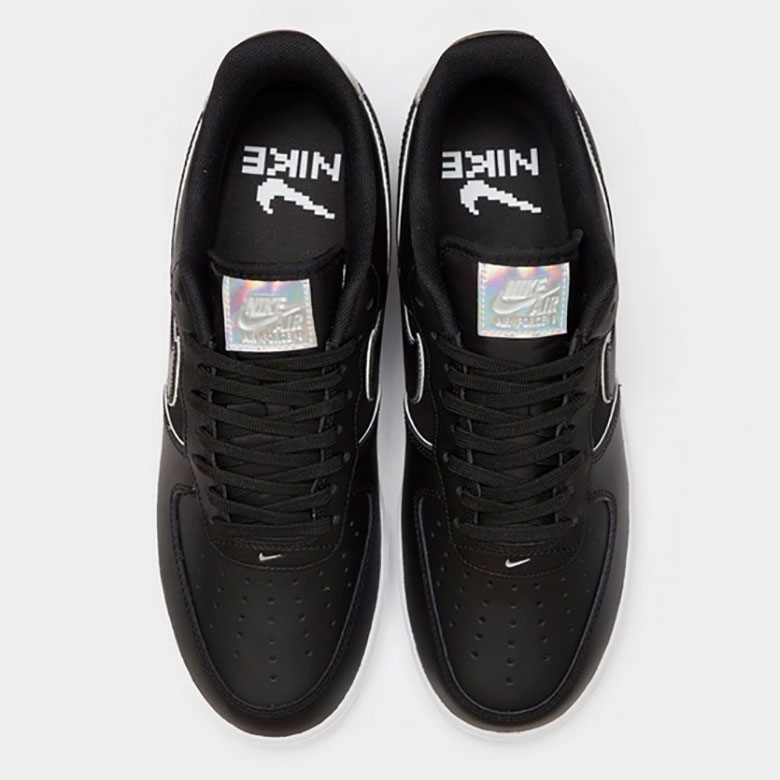 鞋面以黑色皮革打造,鞋底为白色,整体造型极为经典。最具看点的就是 Swoosh Logo、鞋舌、后跟等处以炫彩反光材料打造,个性又炫酷。鞋垫上印有像素风 Swoosh Logo,也是前所未见的全新设计。