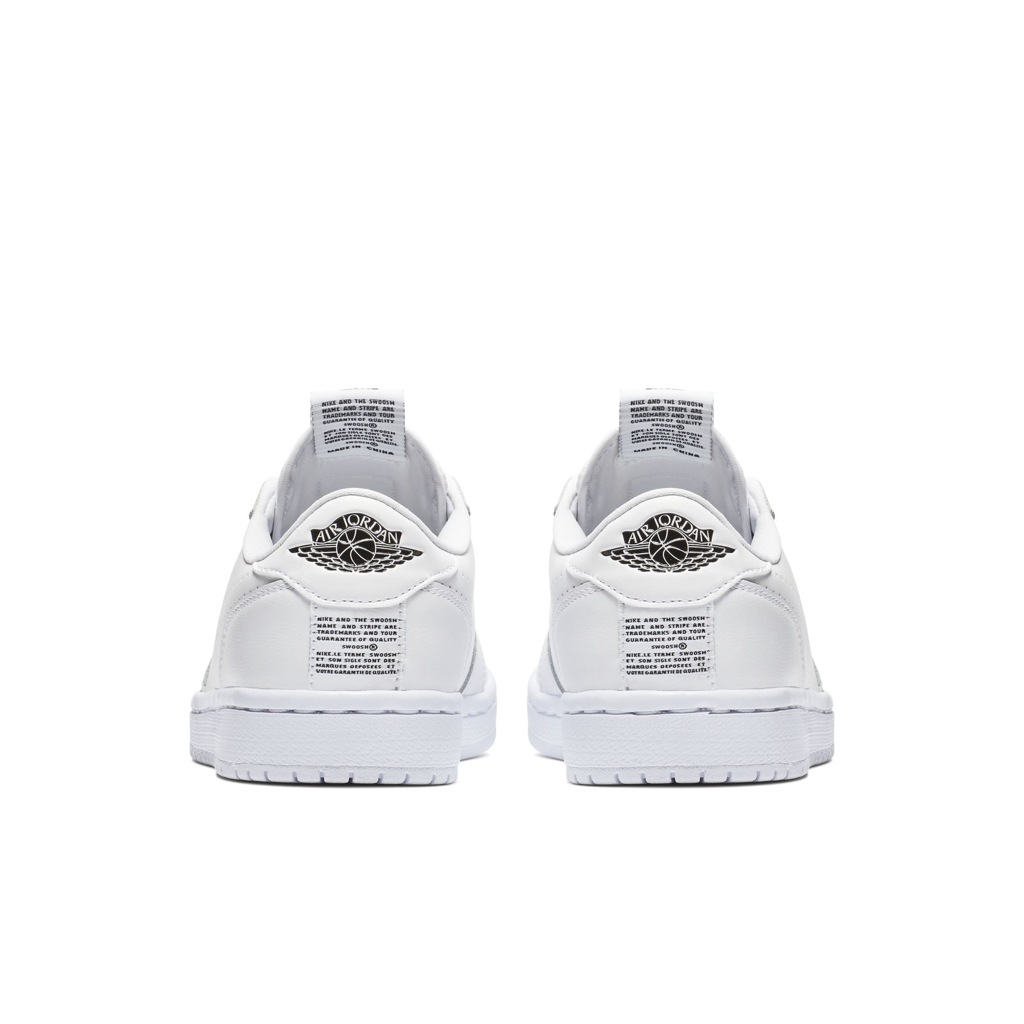 没有了鞋带的遮挡,鞋舌上以多个 Nike Swoosh Logo 及 Jordan Brand Logo 标签贴装饰,后跟以商标标签呼应鞋舌。