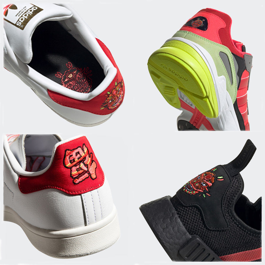 同时在细节设计上 Stan Smith 在后跟处加入倒置的 “福” 字,完美对应中国的福到文化,其余三款球鞋则绣有 “年兽” 图案,满满的除夕气息。