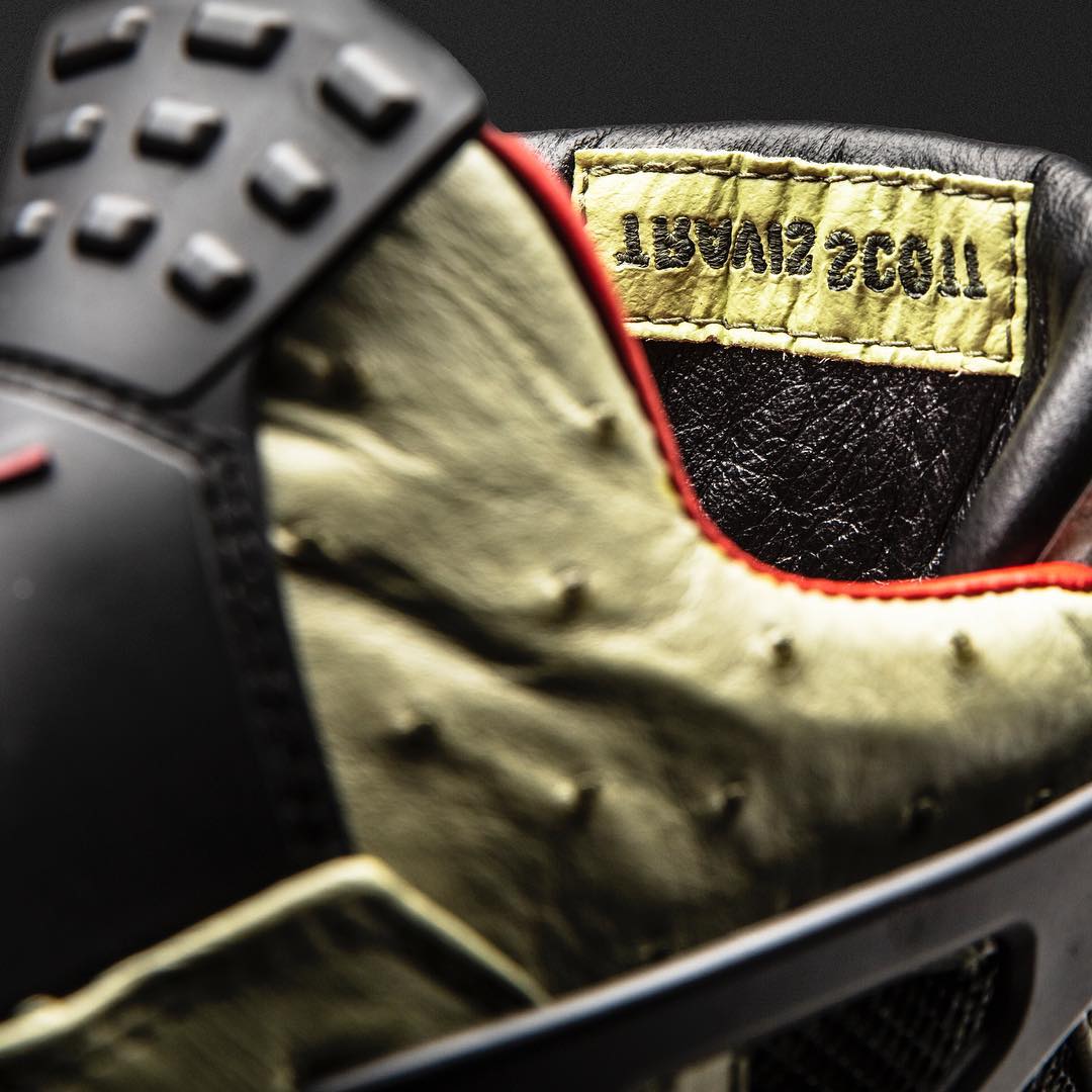 除了鸵鸟皮自带的特殊纹理之外,橄榄绿色还为整体带来几分军事风格的硬朗感受,值得注意的是左右脚后跟处的 Logo 不同,分别为 Travis Scott 的个人专属 Logo 和 Jumpman Logo,这样的设计值出现在了亲友版本的 Travis Scott x Air Jordan 4 中。