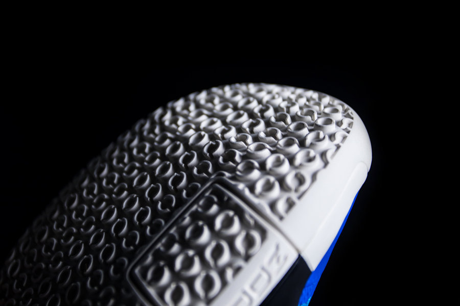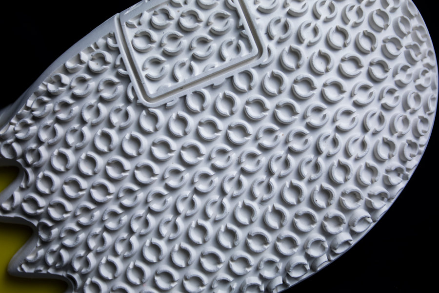 整双鞋中最奇特的设计都汇集在外底部位,可以看到外底的纹理极为统一,密集圆环带有不同方向的开口设计,提升外底不同方向上的摩擦受力,达到更好的变向急停效果。