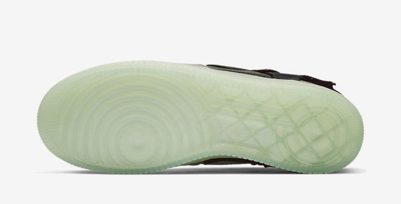 鞋面以灰、黑色荔枝皮打造,浅绿色鞋底包裹纯白色 Air Force 气垫,后跟鞋领及 AF1 标签以亮橘色点缀,机能气质冷酷质感。