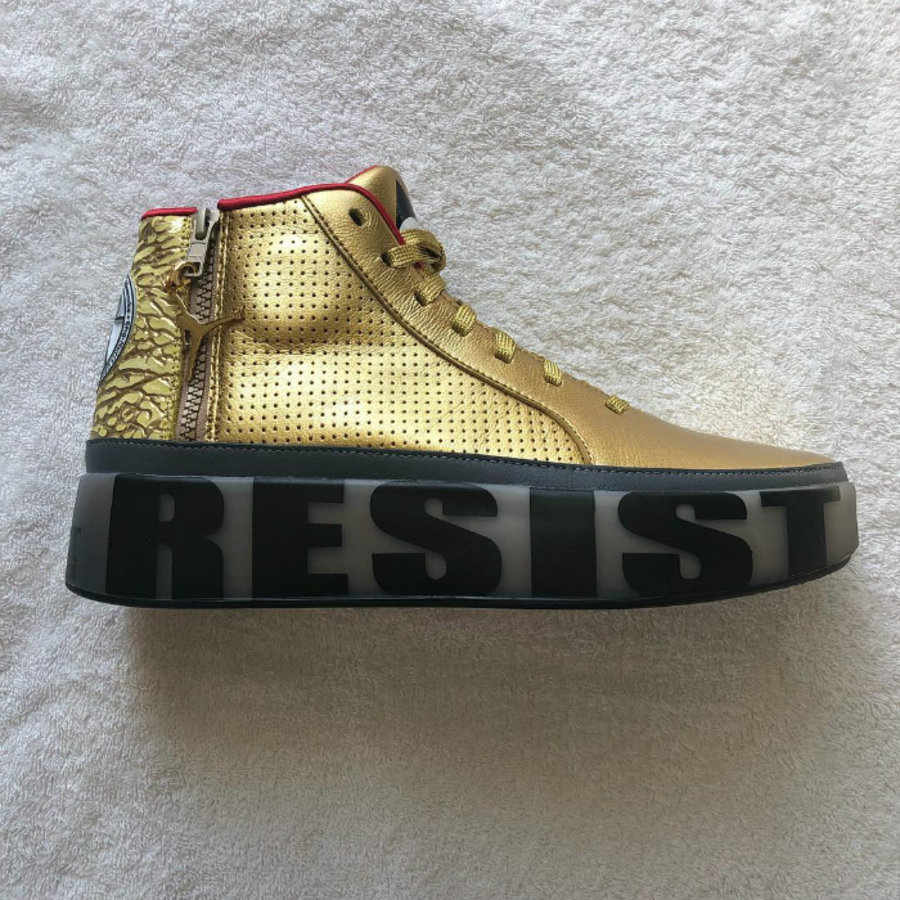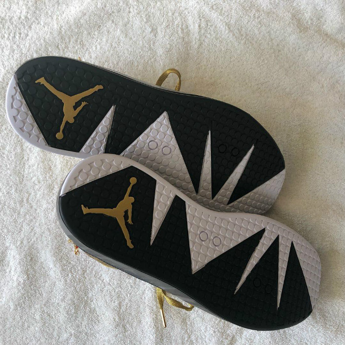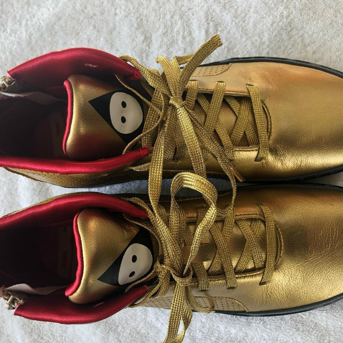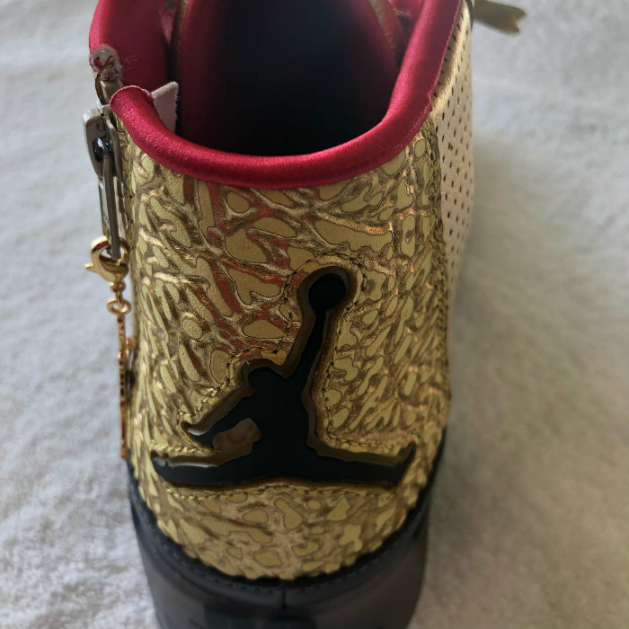 在红毯上脚一双金光闪闪的定制 Jordan 球鞋,经透露,该鞋由 Jordan Brand 著名球鞋设计师 Tinker Hatfield 为他专属打造。