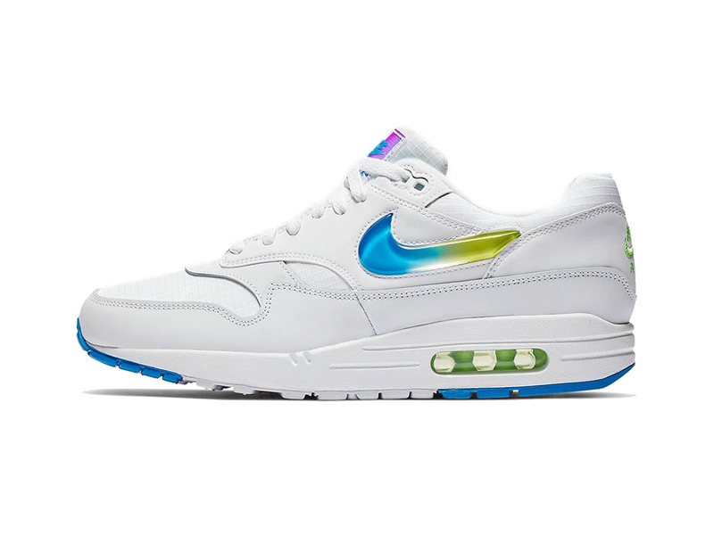 鞋面以纯白为底色,使用皮革搭配机能网布,在清爽的同时依旧兼顾保暖和防水性能。最具看点的是 Swoosh Logo 的设计,使用透明橡胶打造,带有蓝黄渐变效果,酷似果冻的质感十分讨喜。