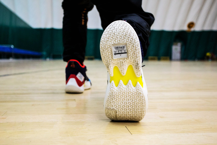 这样的设计在实战中会更为灵活,对于起速和变向都有加成,中间部位加入大块的硬质 TPU 起到抗扭转保护作用。