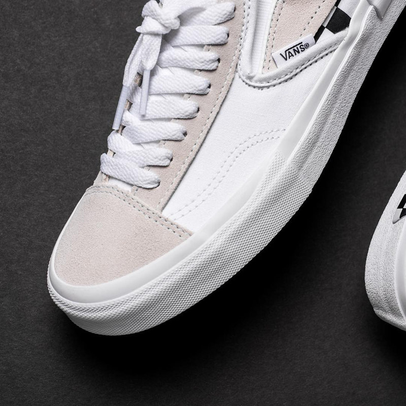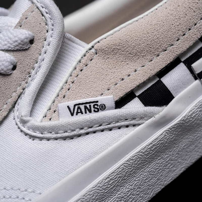 其中 Vans Slip-On Cap 选用的黑、白、灰三色,简洁的白灰鞋面搭配单侧棋盘格元素,并在鞋舌和鞋底加入了解构贴片,设计独特。