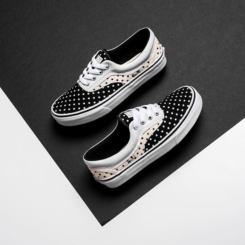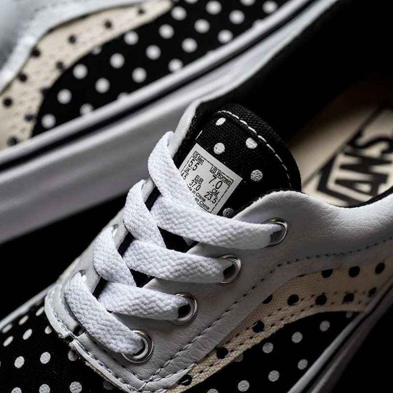 另外一双 Vans Era 鞋面采用大面积黑、白波点,鞋带及鞋身位置为米白色、黑色波点,并将鞋码标以印刷质感加在后跟位置,趣味十足。