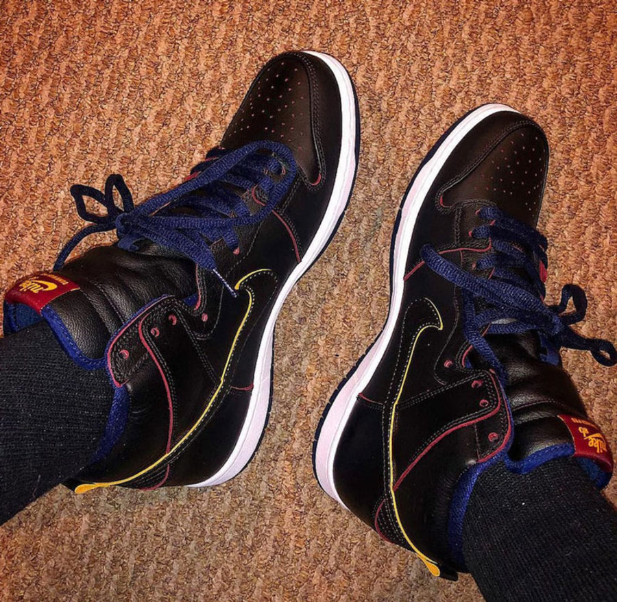 鞋面采用了 “刮刮乐” 设计,可以利用酒精棉擦掉鞋面的黑色,呈现出酒红色为主的装扮。辅以海军蓝的鞋底以及黄色 Swoosh 这也与骑士队的球衣完美呼应。