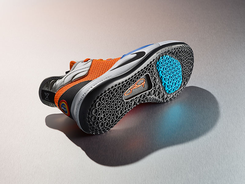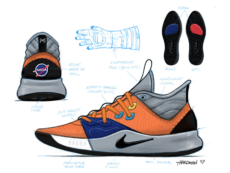 乔治以家乡 NASA 研究中心为配色灵感,印在鞋后跟处的文字来源于人类对月球的探索,也是乔治最爱的格言之一:Don't tell me the sky's the limit when there are footprints on the moon。