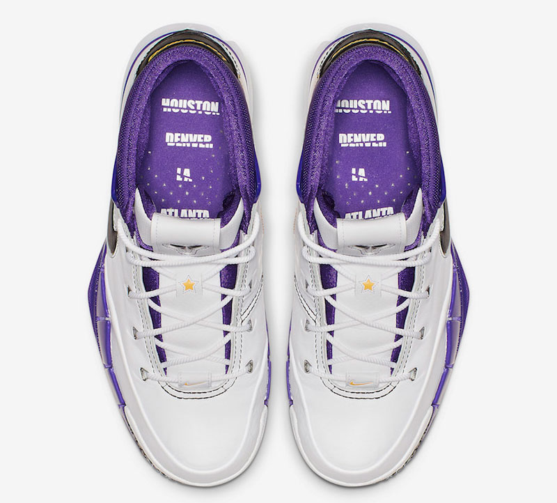 此双鞋以白色和紫色为主,再加上鞋舌上的黄色点缀,致敬当时科比所在的湖人紫金队服,在赛场上穿着这双鞋出战再合适不过。