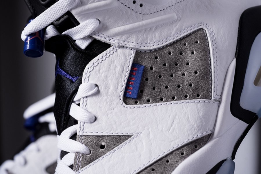 以白色荔枝皮革搭配煤灰色翻毛皮打造,鞋舌 Jumpman Logo、鞋带扣辅以亮紫色点缀,形成鲜明对比。
