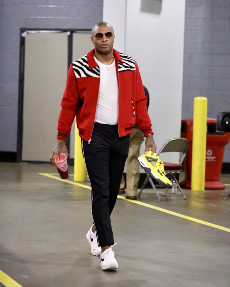 Tim Hardaway Jr. 一席黑衣装扮,脚下率先穿上了还未市售的灰粉 Air Jordan 1 “Hyper Crimson”,非常亮眼吸睛!